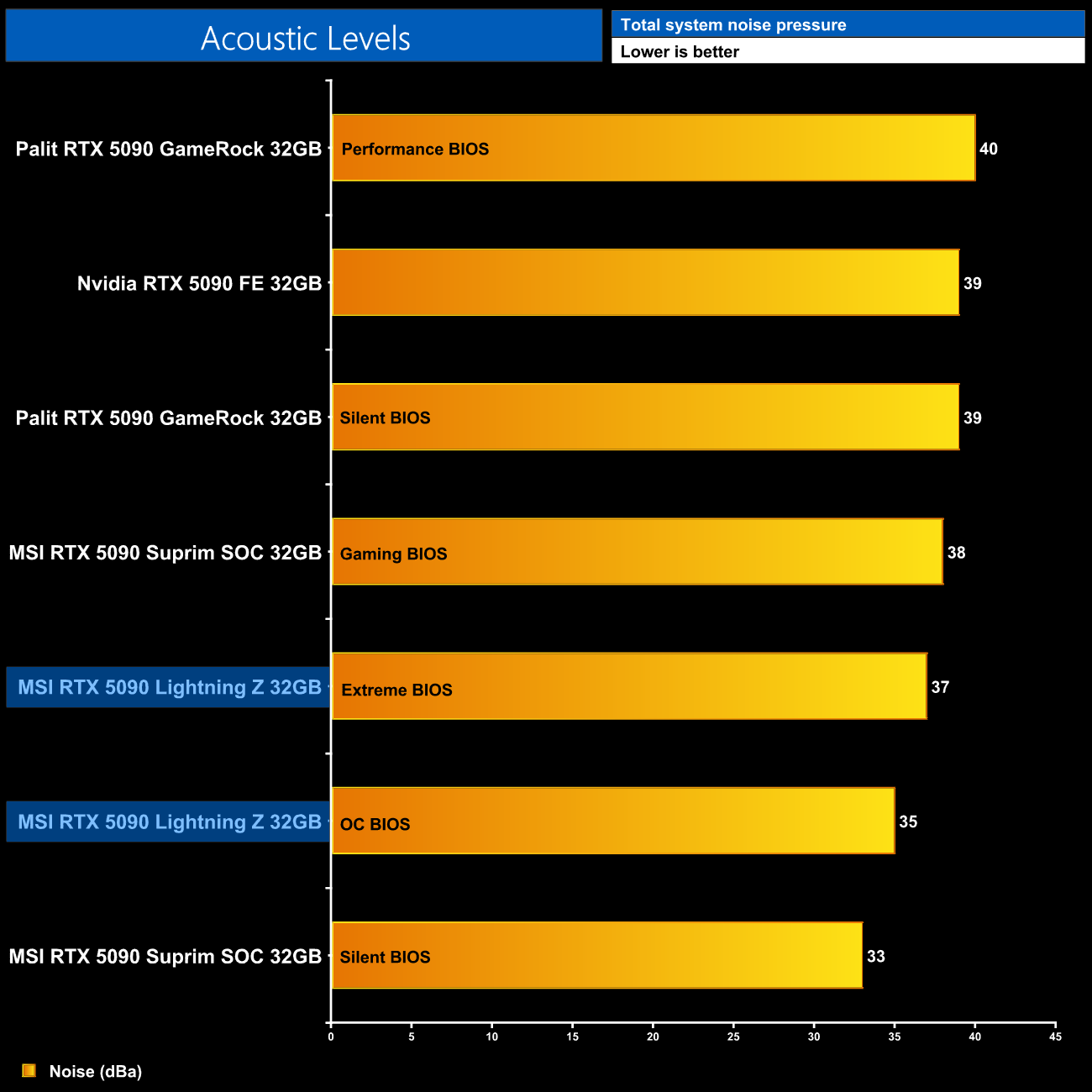 As for noise levels, considering there's no fan on the card itself, all the noise is down to the AIO. Using the OC BIOS we saw the fans running at 1220rpm, and that hit 35dba, whereas the Extreme BIOS is louder at 37dba, given the fans increased to 1490rpm. That means the Suprim Silent BIOS is still the quietest 5090 we've ever tested, but the Lightning Z is hardly loud and still quieter than the rest of the other 5090s.