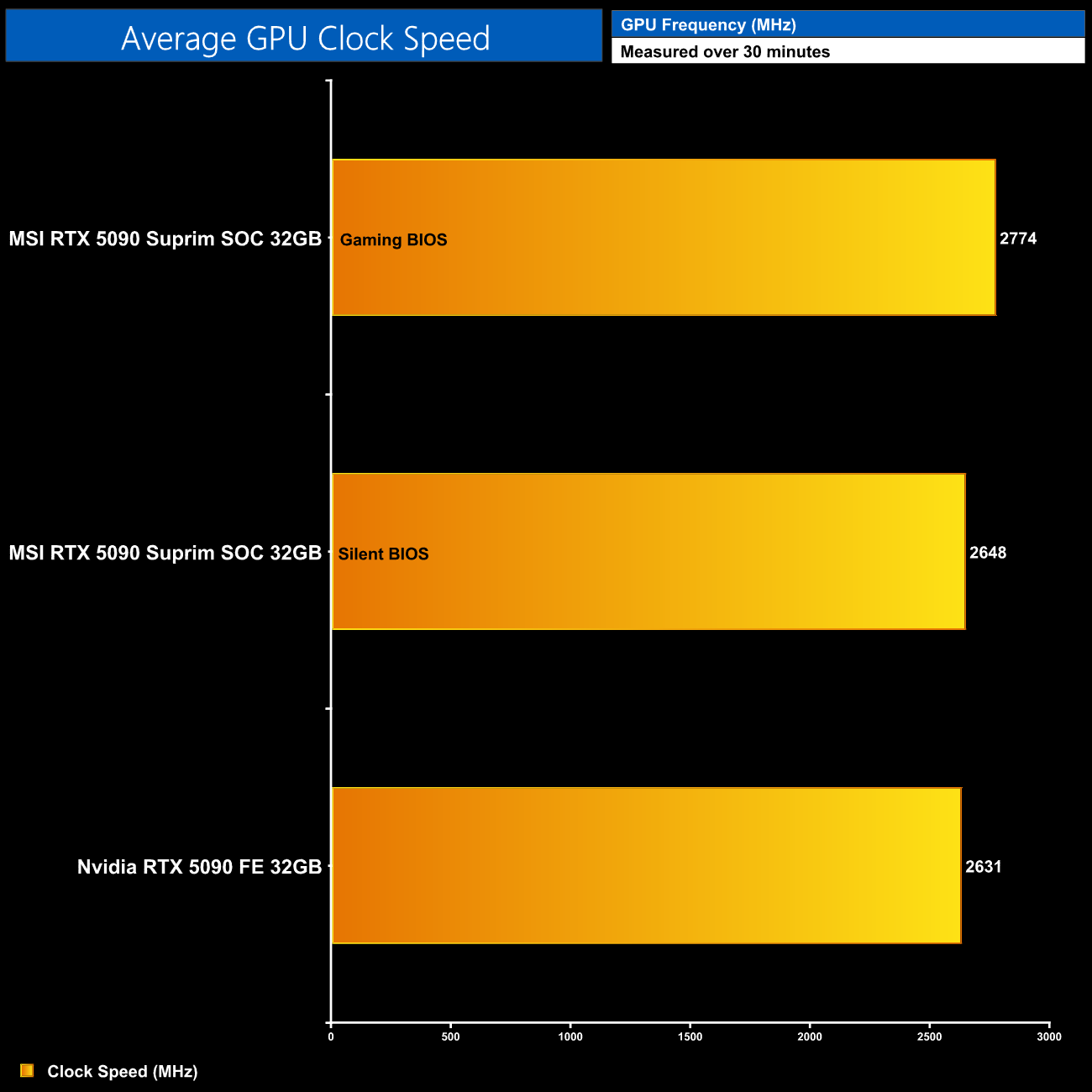 Averaged over the thirty minute run, the Gaming BIOS hit 2774MHz, a good 140MHz faster than the 5090 FE, while the Silent BIOS was just under 20MHz faster than Nvidia's model.