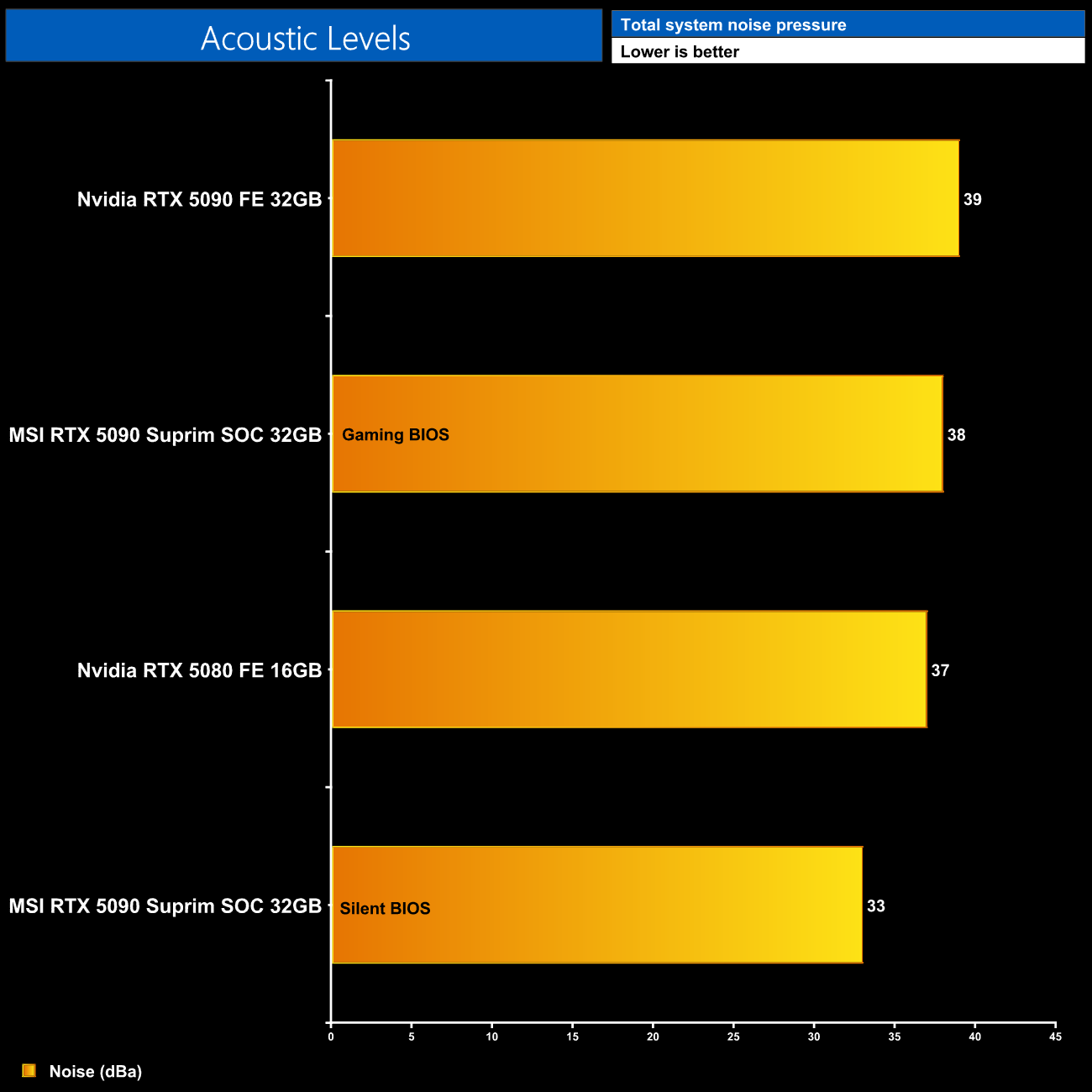 We take our noise measurements with the sound meter positioned 1 foot from the graphics card. I measured the noise floor to be 32 dBA, thus anything above this level can be attributed to the graphics cards. The power supply is passive for the entire power output range we tested all graphics cards in, while all CPU and system fans were disabled. A reading under load comes from running Cyberpunk 2077 for 30 minutes.