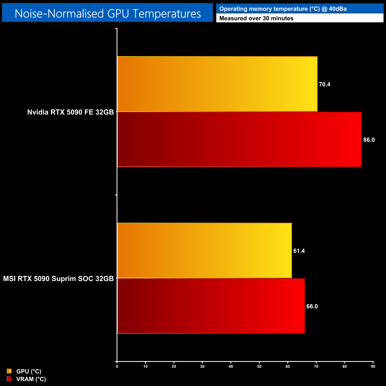 As a final test, we increase fan speed until we hit 40dBa output, and then run the thermal tests again. We can clearly see that the Suprim SOC is a more efficient cooler design than the Founders Edition, with the GPU hitting 61C, while the VRAM peaked at 66C. Of course, we would expect this given the sheer size differences, but the proof is in the pudding, as they say.