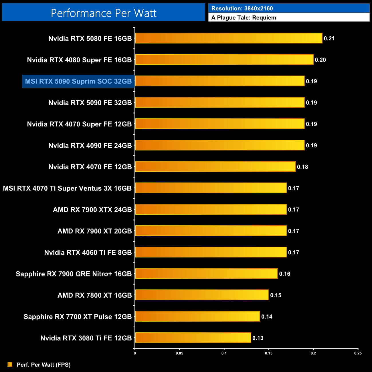 Despite that increased power draw, general efficiency is on par with the 5090 FE, given the Suprim SOC also runs faster – the differences effectively cancel themselves out.