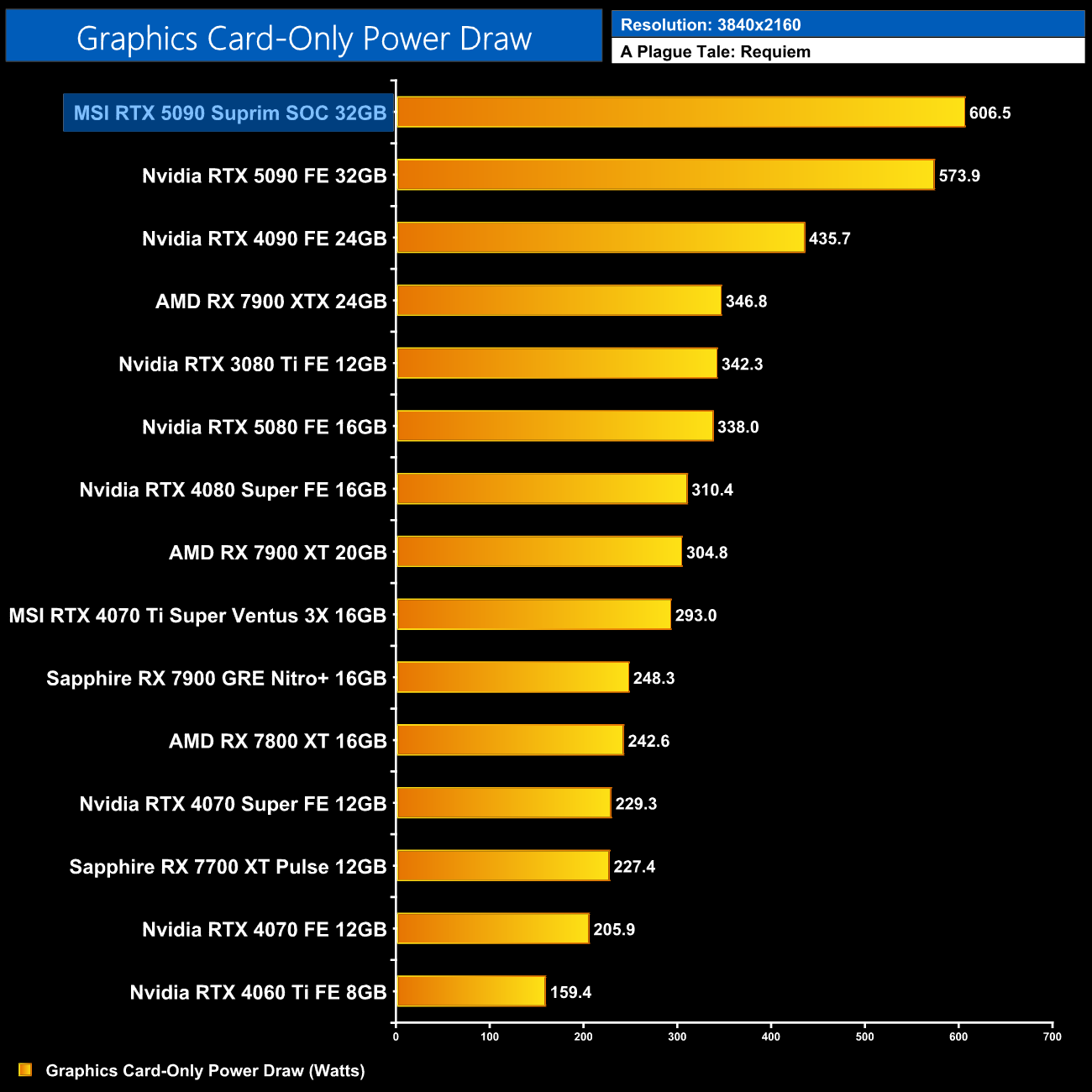 Power draw has increased for the Suprim SOC, at least when using the Gaming BIOS. This saw an average result of 606.5W when running A Plague Tale: Requiem at 4K, which is the game where we saw the highest power draw in our day 1 RTX 5090 review. That means the MSI card pulls about 6% more juice than the FE.