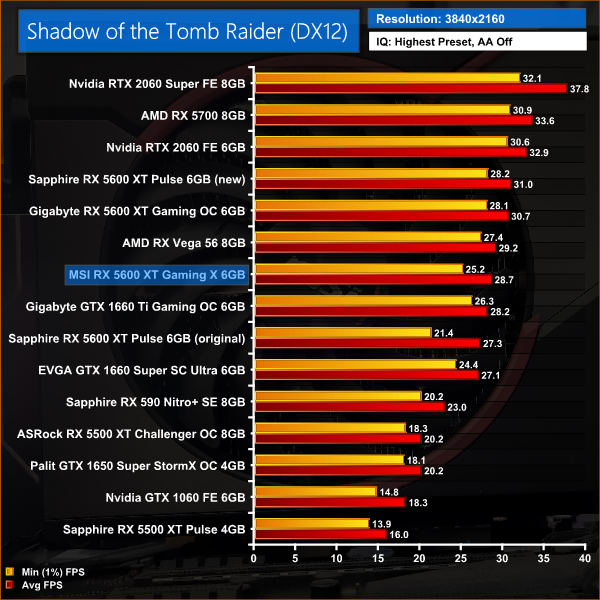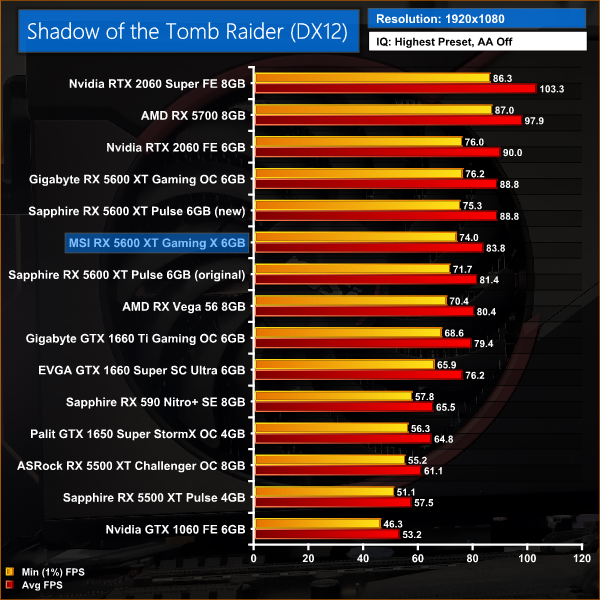 Shadow of the Tomb Raider shows very similar performance margins to Red Dead Redemption 2. For instance, the Gaming X is no more than 3% faster than the Pulse with its old BIOS, either at 1080p or 1440p. The Pulse when running the new BIOS, however, is 6% faster at 1080p and 7% faster at 1440p.