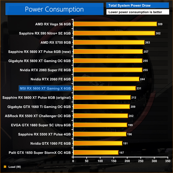 As for power draw, the Gaming X sits neatly between the 5600 XT Pulse using its old BIOS, and the Pulse with its updated BIOS. This gives an interesting look at the difference memory speed makes on power draw, though there are also other factors at play. Either way, total system power draw is pretty much as expected.
