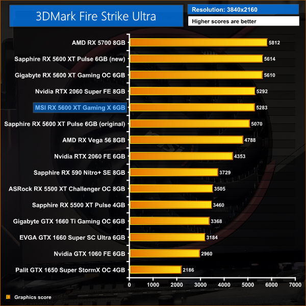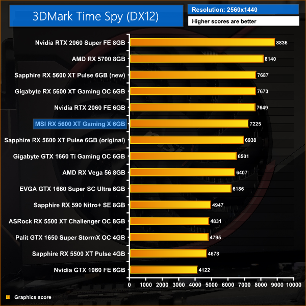 Kicking things off with our 3DMark benchmarks, we can immediately see the Gaming X is at a disadvantage compared to the Sapphire Pulse (14Gbps and 1750MHz boost clock with the BIOS update.) Across all three benchmarks, the Gaming X is 6% slower than the Pulse due to its slower memory.
