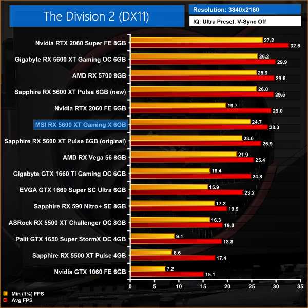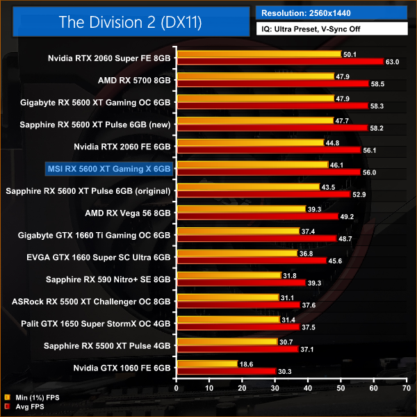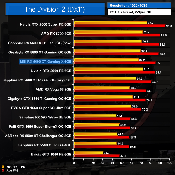 In the Division 2, we see more favourable results for the Gaming X – it would seem this game responds better to increased GPU speed as opposed to increased memory speed. At 1080p for instance, the Gaming X is just 4% slower than the Pulse with its new BIOS, while compared to the Pulse using the old BIOS, MSI's card is 6% faster.