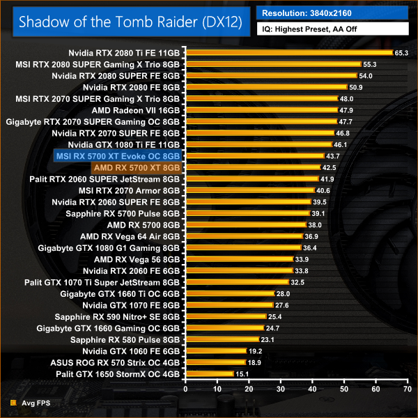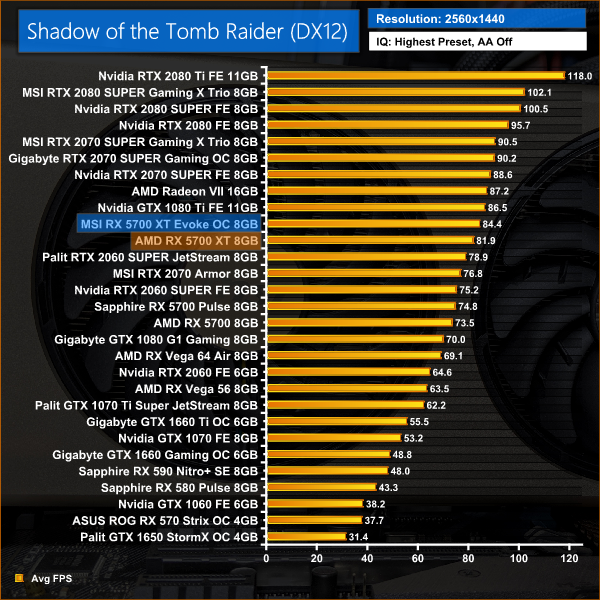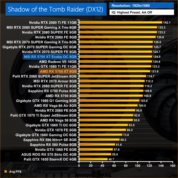 Our last game of the day, Shadow of the Tomb Raider has the Evoke OC 3% ahead of the reference 5700 XT across all three resolutions tested.