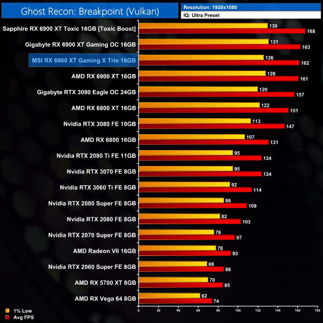 Here we come to Ghost Recon Breakpoint. The Gaming X Trio is once more looking at a sizable 15% performance deficit compared to the RTX 3090 at 4K. It is however 3% faster than the reference card.