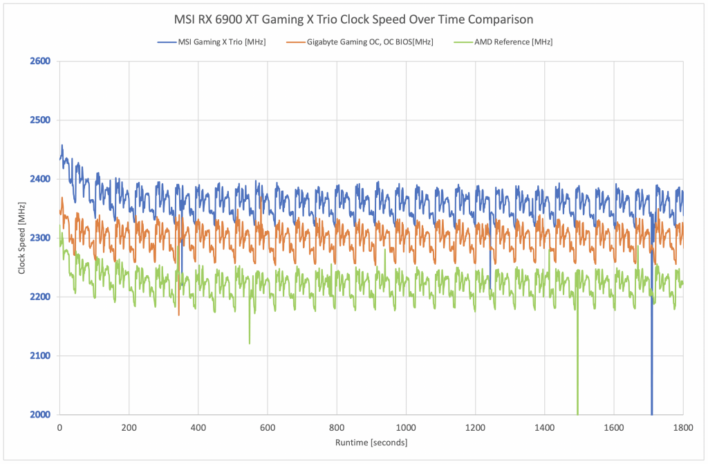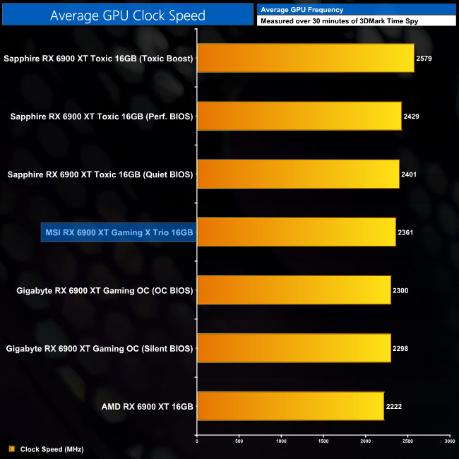 In terms of its clock speed, the Gaming X Trio has the highest rated boost clock of all the air-cooled RX 6900 XTs we have tested so far, so it is not a surprise to see that translate into real-world performance. Over our 30-minute stress test, the GPU averaged 2361MHz, making it 61MHz faster than the Gigabyte Gaming OC, and almost 140MHz faster than the reference card.