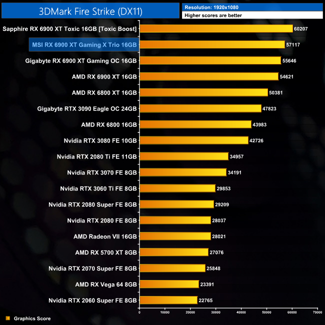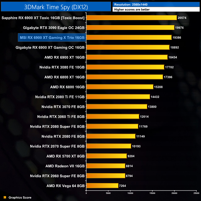 Starting off with 3DMark, we can see some decent results from the Gaming X Trio. Across all three tests, it is 5% faster than the reference card, and only 3% slower than RTX 3090 in Time Spy.