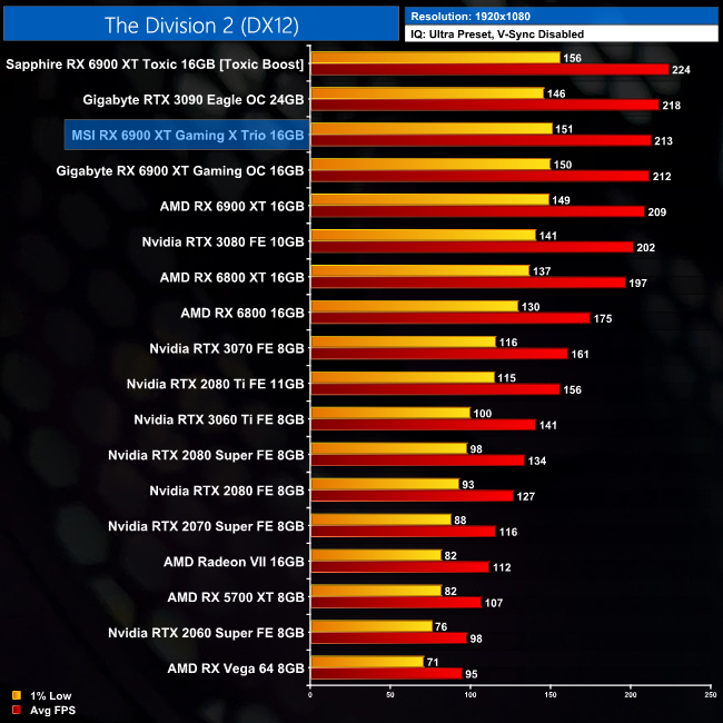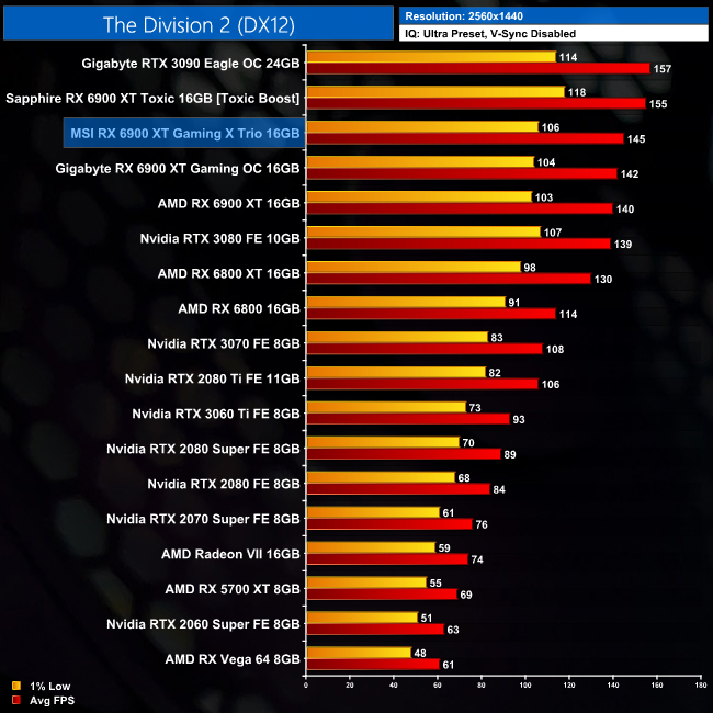 As for The Division 2, the Gaming X Trio comes in 14% slower than the RTX 3090 at 4K. It is, however, still 4% faster than the reference card here.
