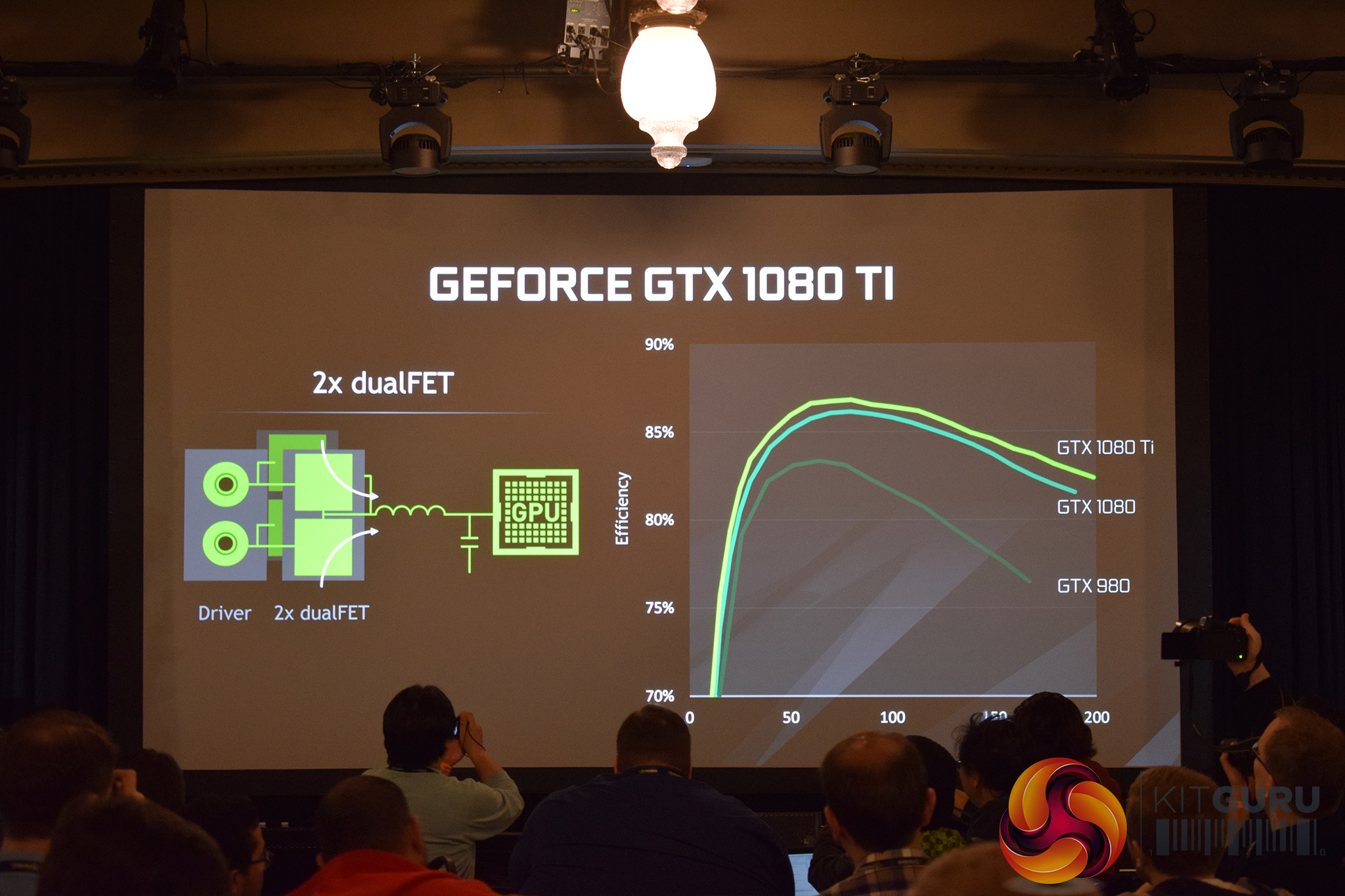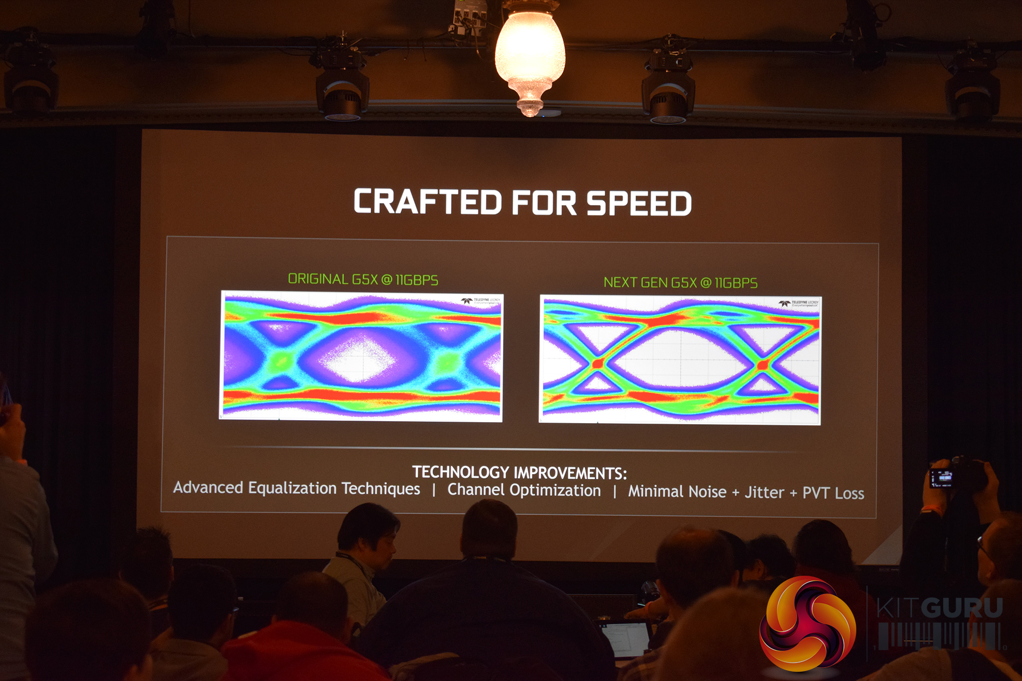 Going into more detail about some highlighted features, let's start with the memory. Nvidia told us that the 1080 Ti uses ‘next-gen' GDDR5X VRAM from Micron that operates over a 352-bit bus – slightly less than the 384-bit bus found on the Titan X. However, the next-gen GDDR5X memory is faster than the Titan X's VRAM, thanks to its 11Gbps (effective) transfer rate. It is this faster GDDR5X – plus the chip's overclocking headroom – which, Nvidia says, makes the 1080 Ti faster than a Titan X.