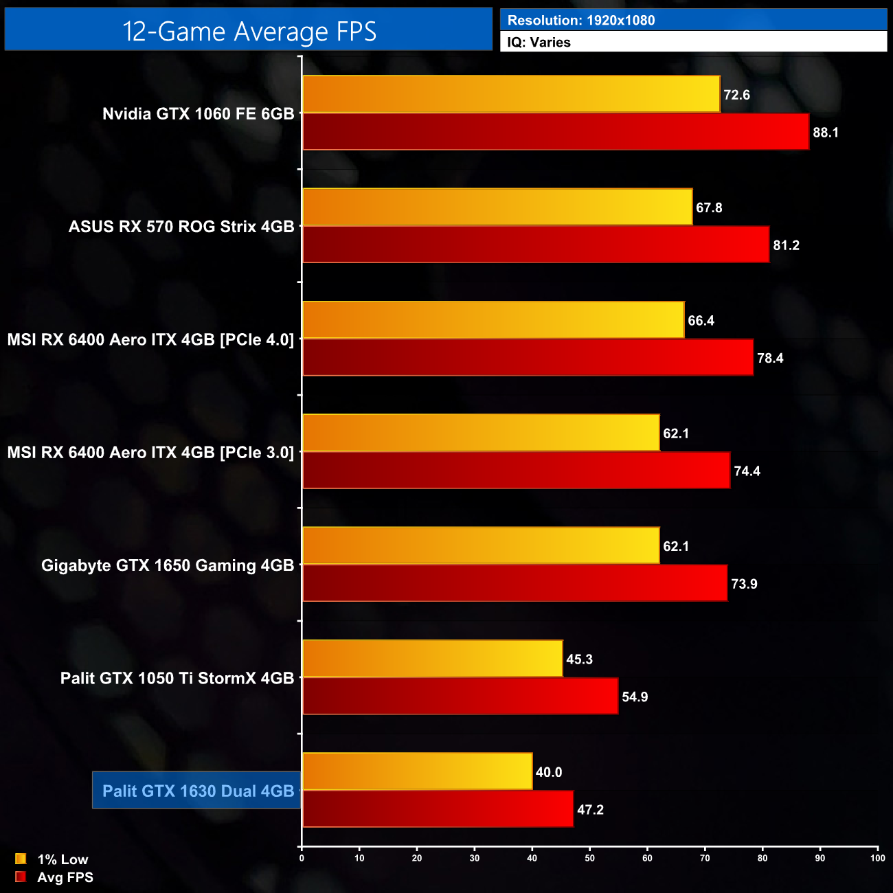 Looking now at the average performance from across all 12 games, it’s pretty obvious that the GTX 1630 is a very weak gaming GPU, even at lower image quality settings. Its average of 47FPS is 14% behind the 1050 Ti – and remember, that GPU came out in 2016 for about £140. The 1630 is also 36% slower than the 1650, and we won’t even mention the other cards we have tested, like the 570 or GTX 1060, which are all miles faster.