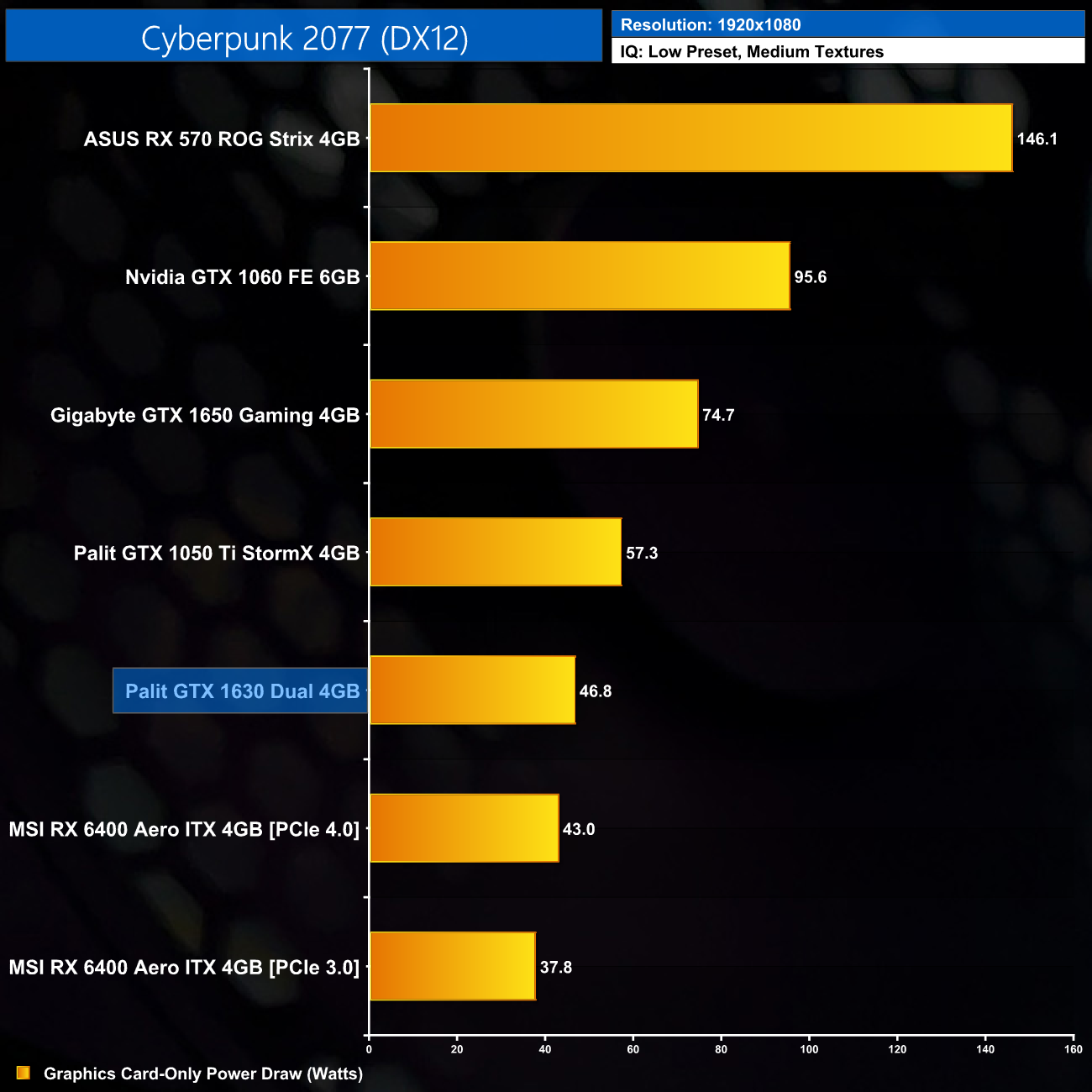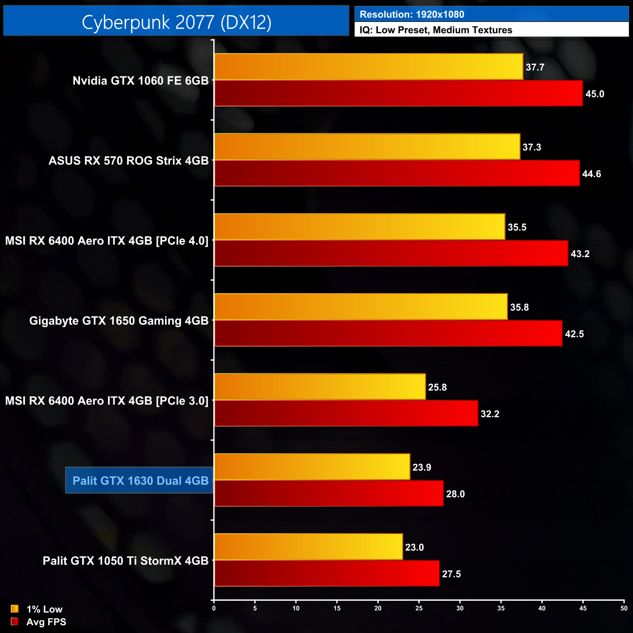 As for the game benchmarks, we are starting with Cyberpunk 2077. Even using the Low preset here, but with medium textures, is too much for the 1630 to handle as it averages just 28FPS. That puts it half a frame ahead of the 1050 Ti, which is pretty meaningless, but it is actually the only time we will see the 1630 ahead of the 1050 Ti in our benchmarks today.