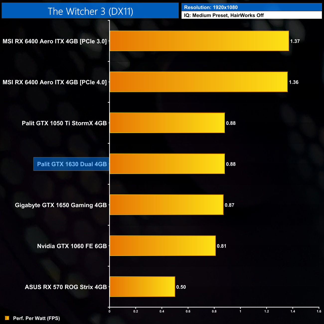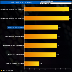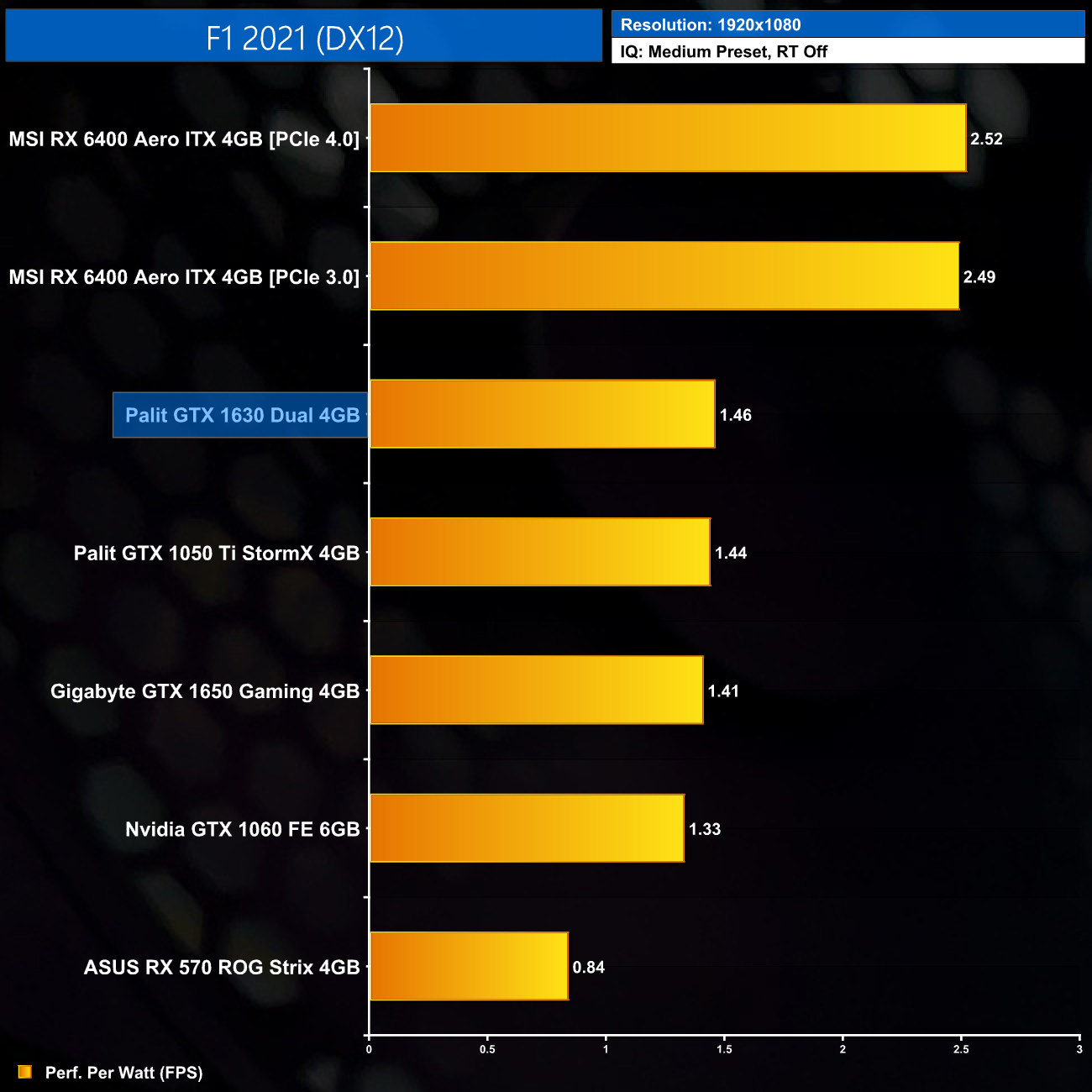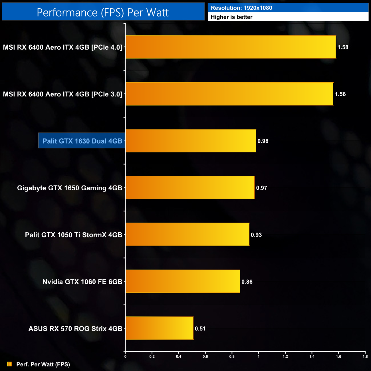 Overall efficiency is on-par with the GTX 1630, which is to be expected. Turing is clearly not as efficient as a more modern architecture like RDNA 2, but with such low power draw it was never going to look overly inefficient.
