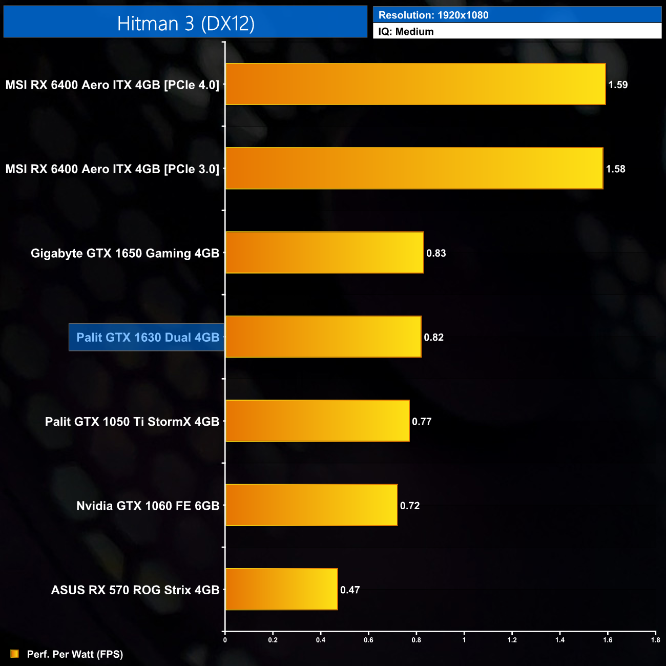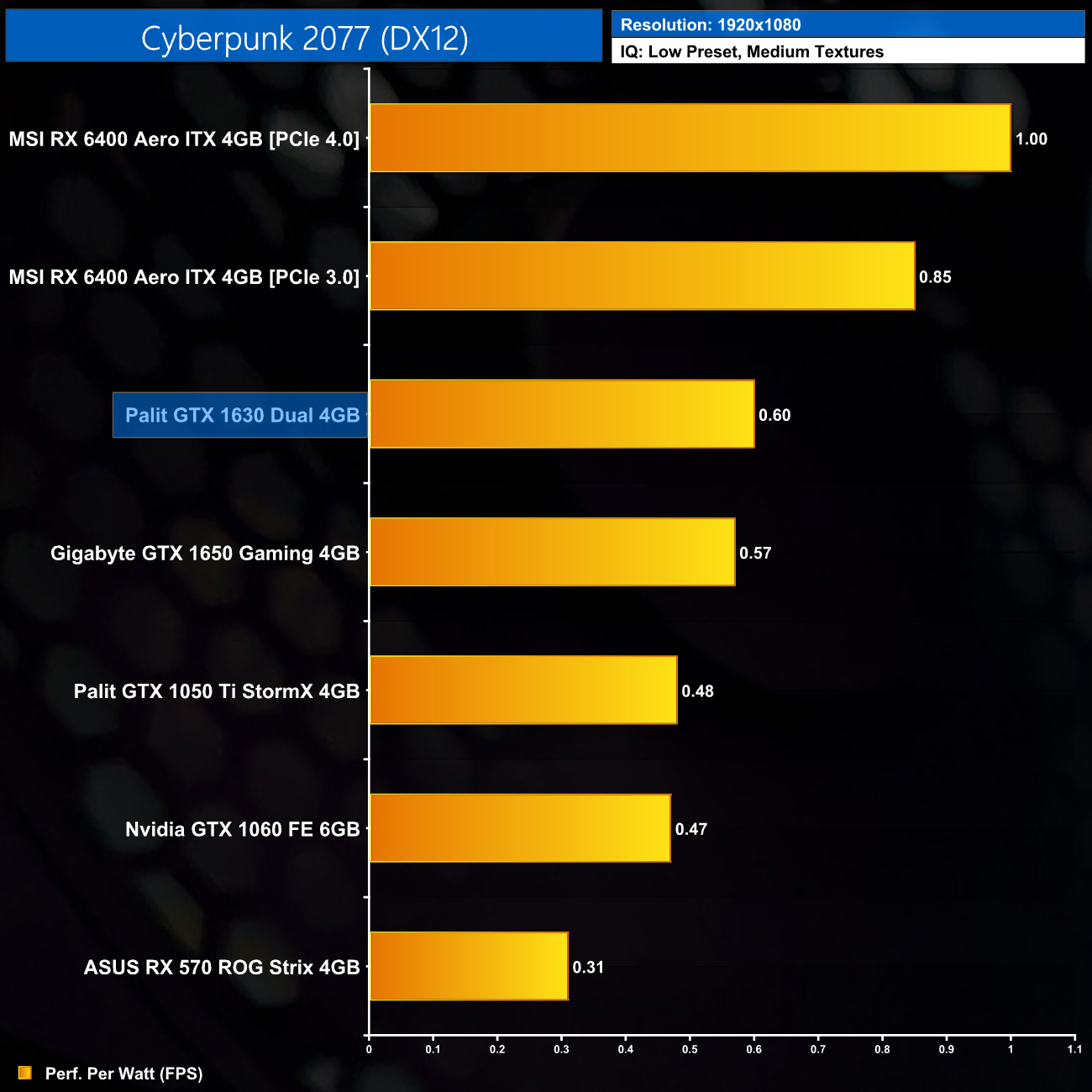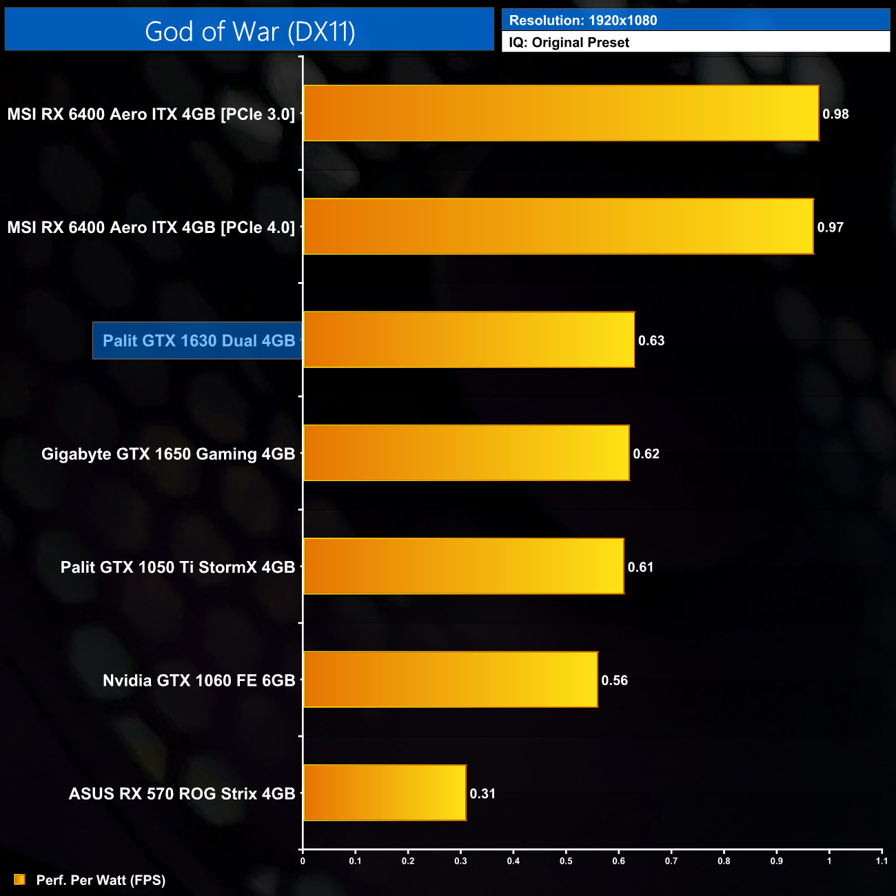 Overall efficiency is on-par with the GTX 1630, which is to be expected. Turing is clearly not as efficient as a more modern architecture like RDNA 2, but with such low power draw it was never going to look overly inefficient.