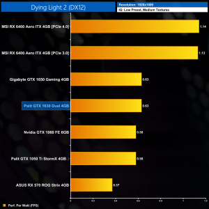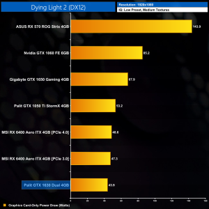 It’s a similar story in Dying Light 2. Again, using the Low preset but with medium textures is just too heavy for this calibre of GPU, and we see just below 28FPS on average. That puts it 35% behind the GTX 1650, while the RX 6400 actually does even better here, hitting over 50FPS.