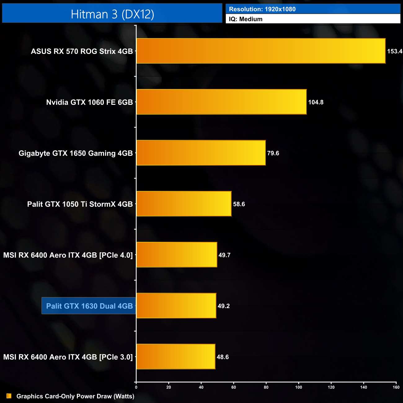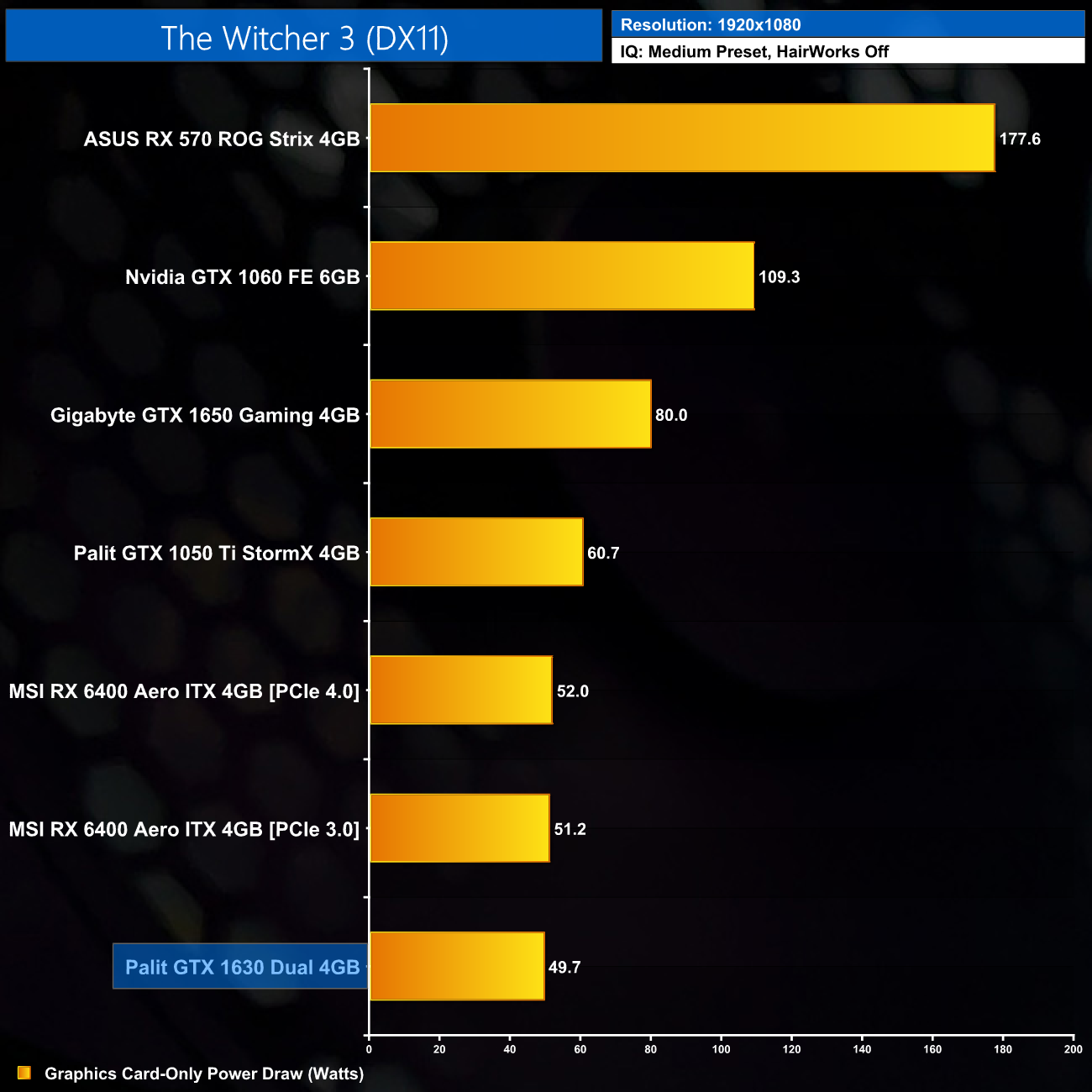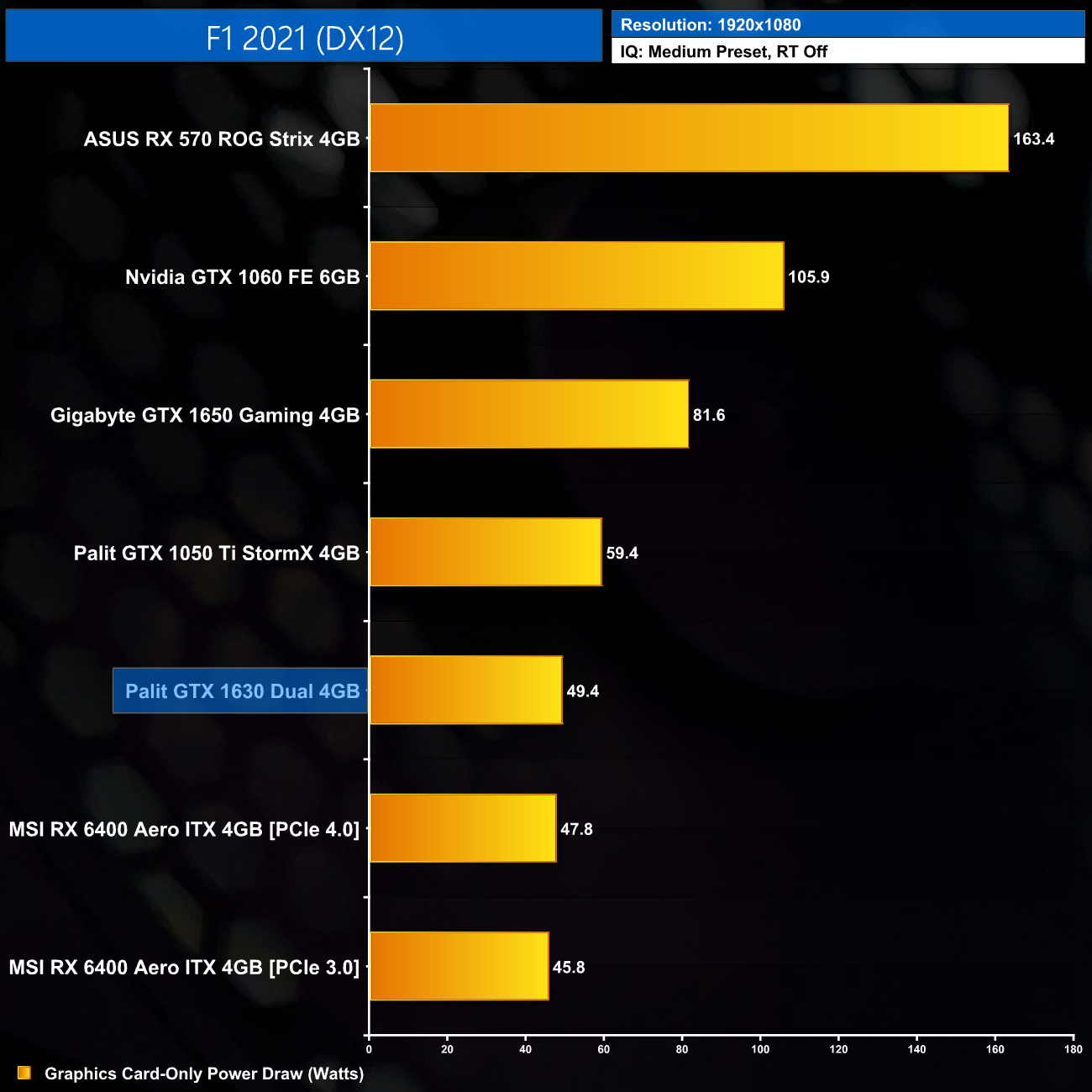 Total system power draw is very low, at around 190W, putting the 1630 roughly level with the RX 6400. Bear in mind we’re using an i9-12900K locked at 4.9GHz, so you can expect to see even lower power figures when pairing this GPU with an i3, for instance.