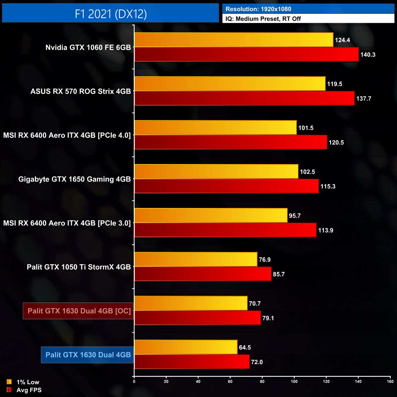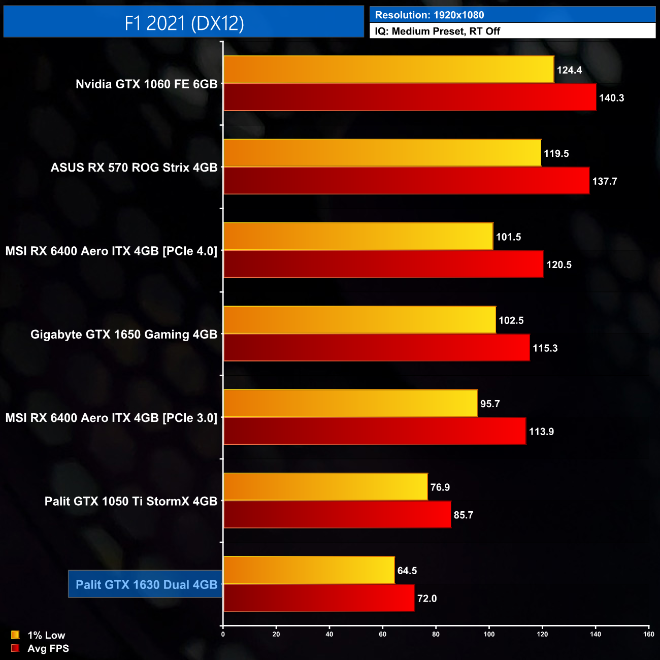 F1 2021 is a less demanding engine and on Medium settings, the GTX 1630 is good for 72FPS on average, which is nice and playable. It’s actually 16% slower than the GTX 1050 Ti however, and about 38% behind the 1650.