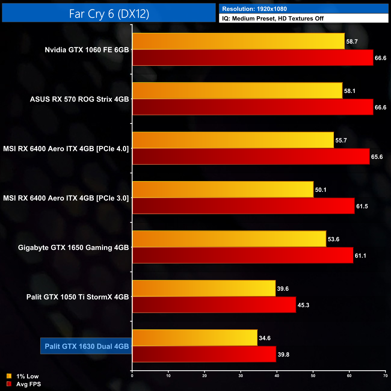 Far Cry 6 is another heavier title, and using the Medium preset the GTX 1630 averages 40FPS. It’s still a league behind the GTX 1650, which is good for 60FPS in this title, while the 1050 Ti delivers another 5FPS on average too.