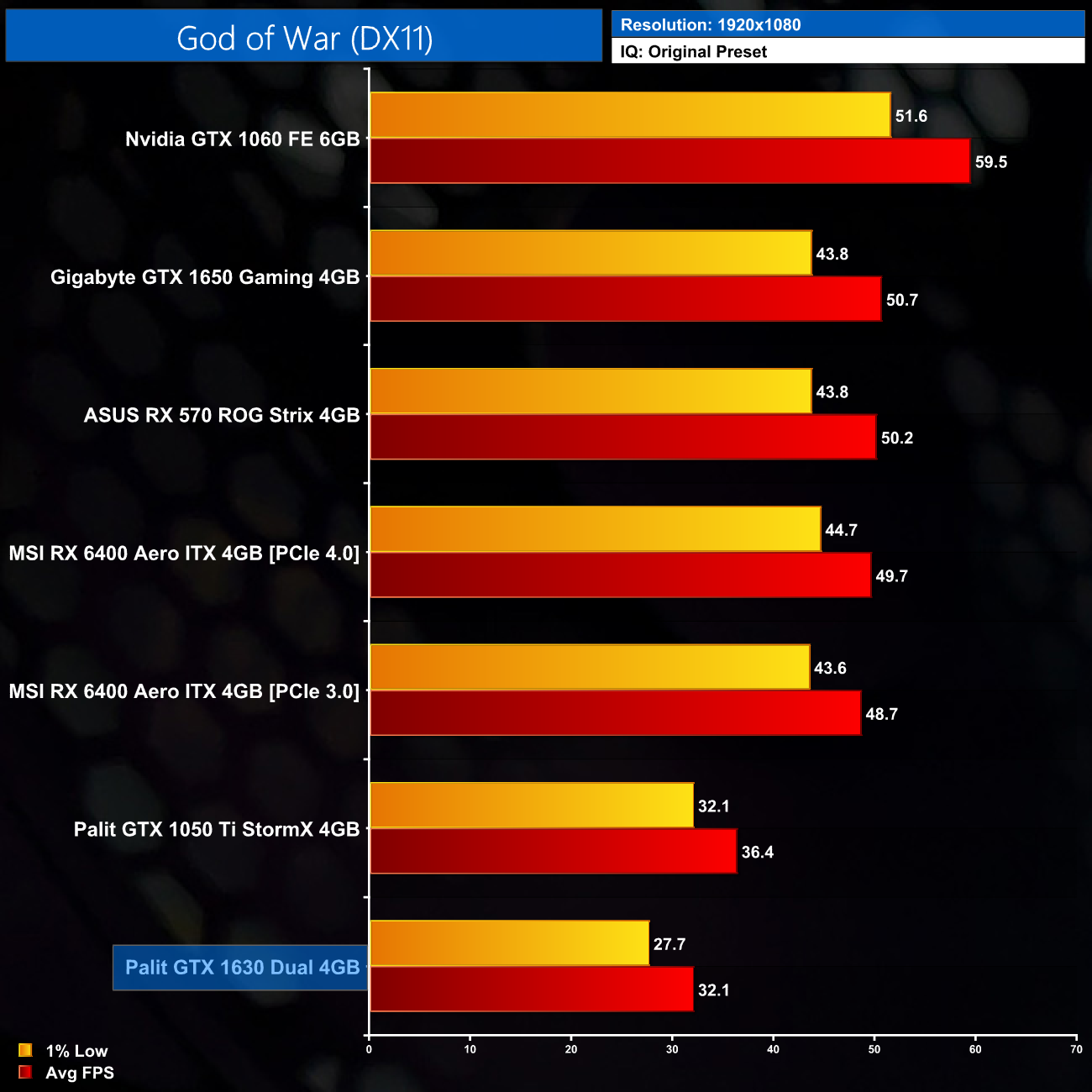 God of War, using the Original preset, which is the equivalent of medium settings in this game, is another title that’s too demanding for the 1630. We do see 32FPS on average, but with 1% lows below 30FPS, you’d want to use the Low preset here instead. Still, the 1630 remains 12% slower than the 1050 Ti and 37% slower than the 1650.