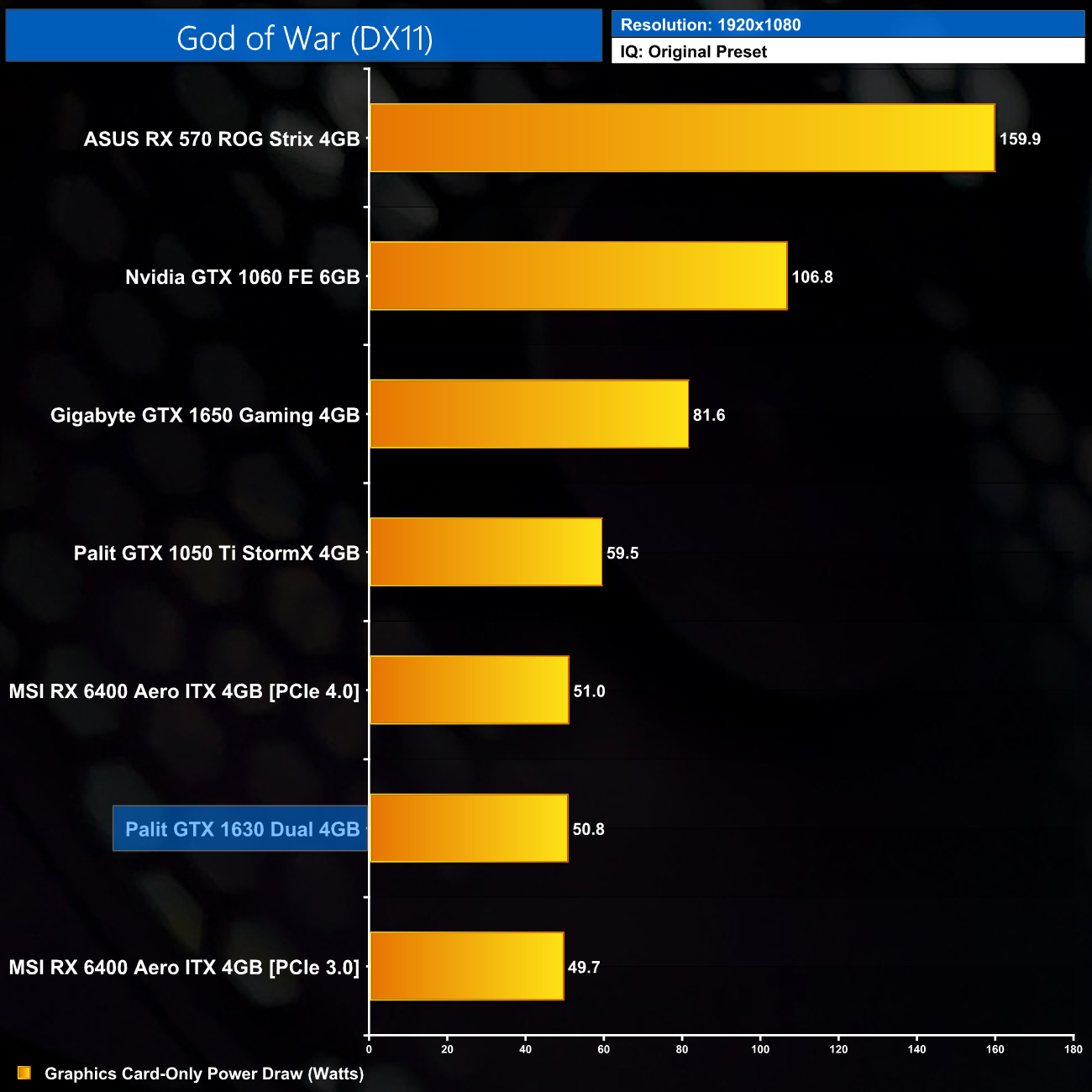 As for power draw of the graphics card only, despite being rated at 75W, we can actually see the average power draw from over 12 games we tested, comes in at below 50W. GTX 1630 is very light on the juice and brings me back to my point about the 6-pin power connector on the Palit Dual, which just looks completely unnecessary.