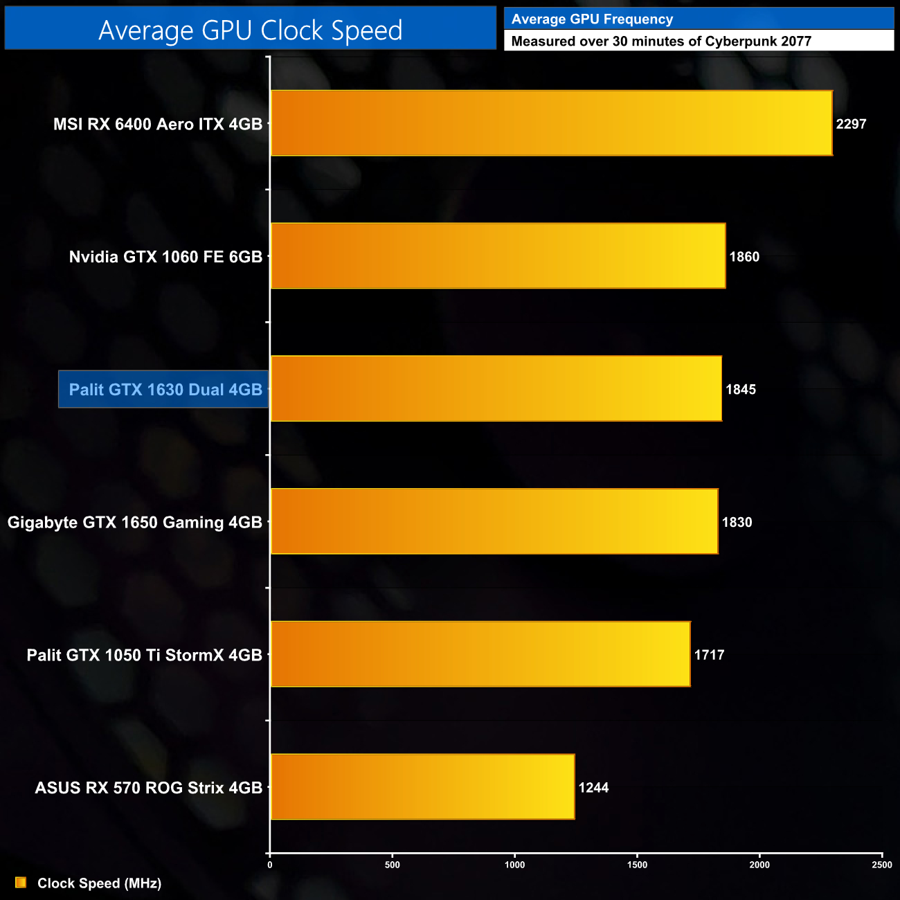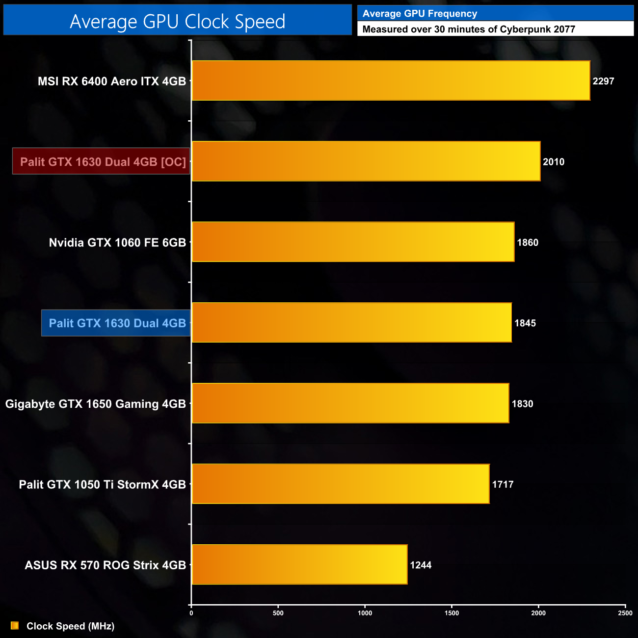 Here we present the average clock speed for each graphics card while running Cyberpunk 2077 for 30 minutes. We use GPU-Z to record the GPU core frequency during gameplay. We calculate the average core frequency during the 30 minute run to present here.