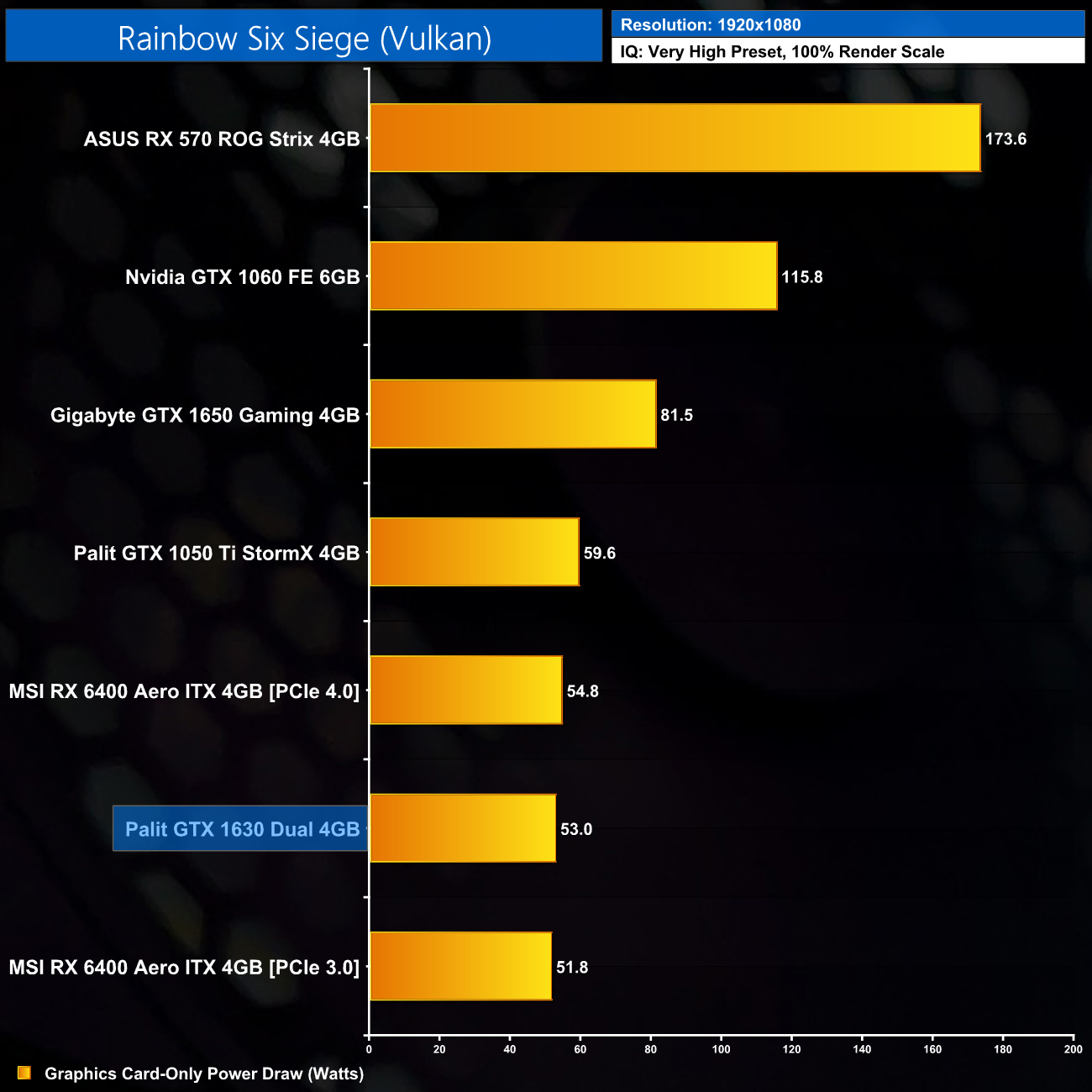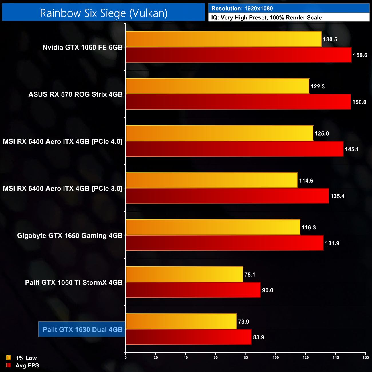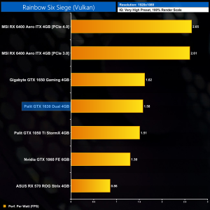 Rainbow Six Siege is next, and here we’re using the Very High preset – but do remember this is an old game and the engine is very easy to run, so we still see an average of 84FPS from the GTX 1630. That’s only 7% behind the 1050 Ti, but I’m not sure that’s a good thing for the 1630 all things considered.
