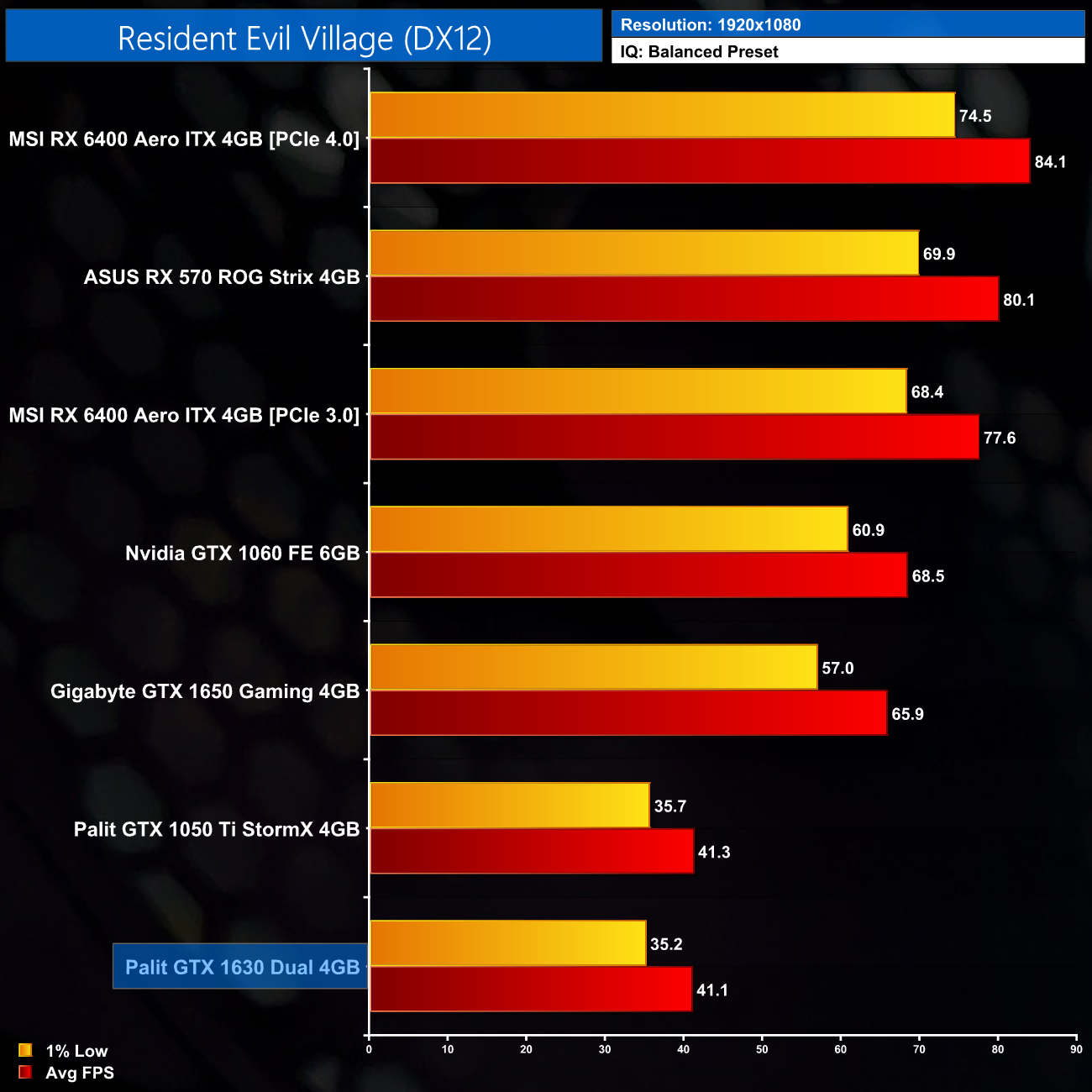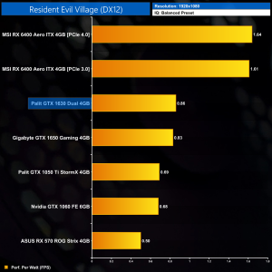 Up next we have Resident Evil Village, where the 1630 averaged 41FPS using the Balanced preset. This is dead level with the 1050 Ti, though again it’s still about 38% slower than the 1650, which was able to maintain over 60FPS.