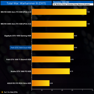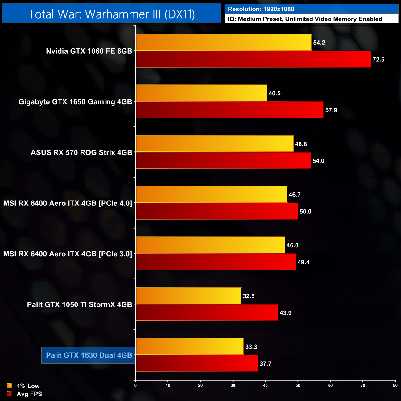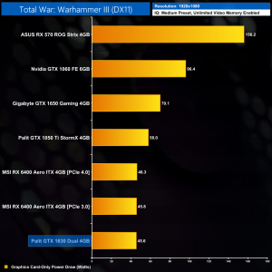 Likewise, Total War: Warhammer III is pretty heavy on the 1630, even when using Medium settings. We see an average of 38FPS here, and that makes the GTX 1630 14% slower than the 1050 Ti, and 35% behind the 1650.