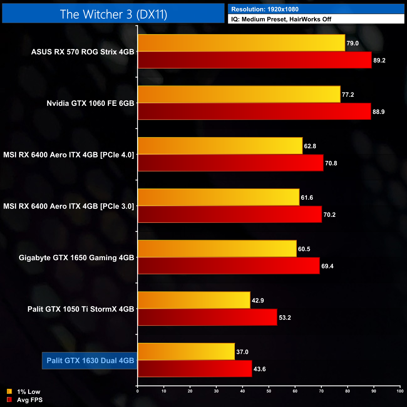 Lastly, we close out with another classic – The Witcher 3. Unfortunately, the trend is now very clear and the GTX 1630 is right at the bottom of the chart. This time, it’s 18% slower than the 1050 Ti and 37% behind the 1650.