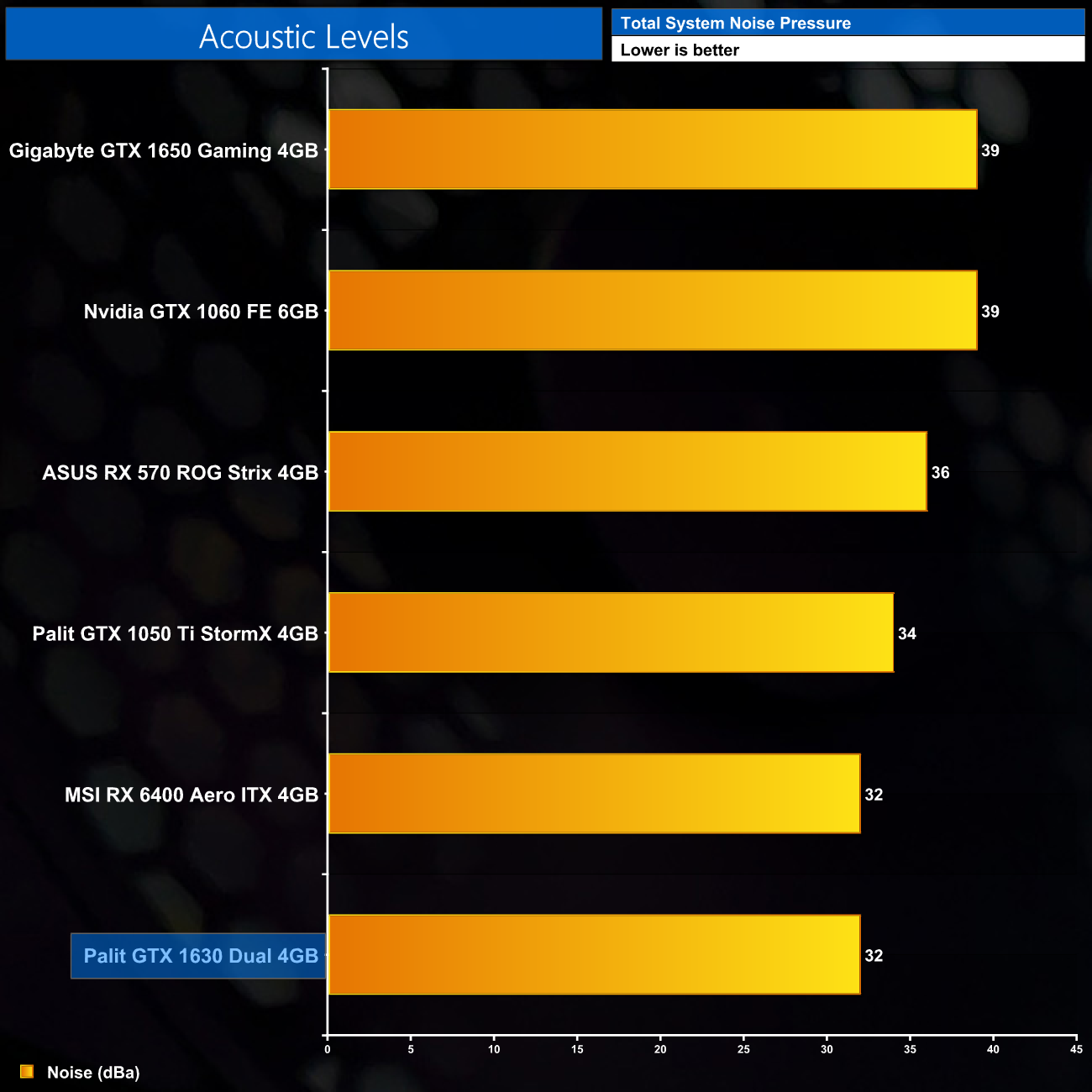 We take our noise measurements with the sound meter positioned 1 foot from the graphics card. I measured the noise floor to be 32 dBA, thus anything above this level can be attributed to the graphics cards. The power supply is passive for the entire power output range we tested all graphics cards in, while all CPU and system fans were disabled. A reading under load comes from running Cyberpunk 2077 for 30 minutes.
