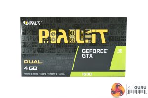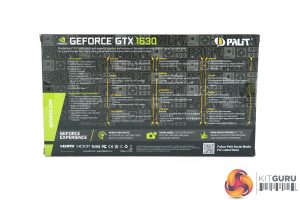 Starting with a look at the Palit GTX 1630 Dual, this ships in a black box, with a large Palit logo written in gold text. On the back, Palit highlights some key features of the GPU in multi-lingual text.