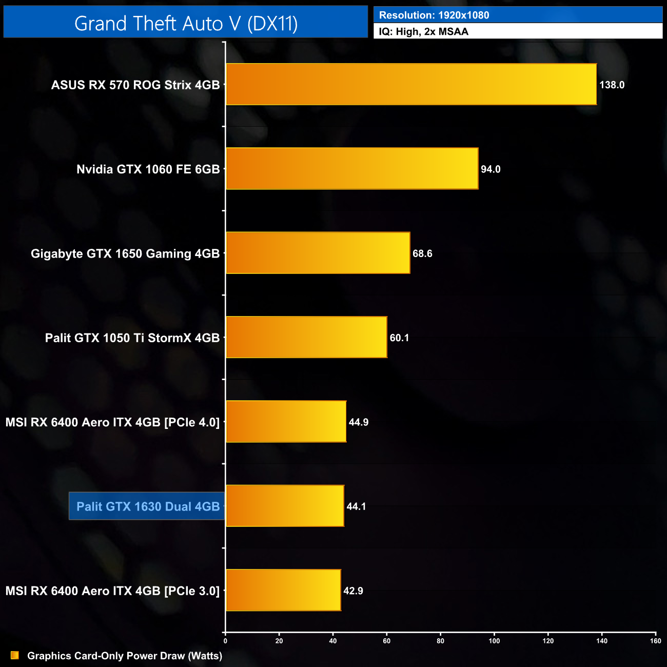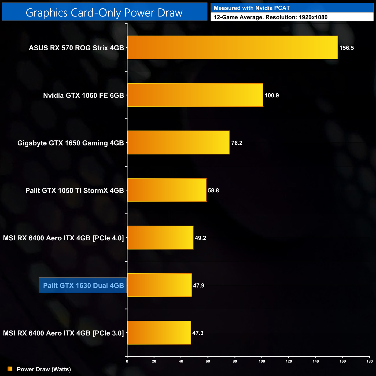 Here we present power draw figures for the graphics card-only, on a per-game basis for all twelve games we tested at 1080p. This is measured using Nvidia's Power Capture Analysis Tool, also known as PCAT. You can read more about our updated power draw testing methodology HERE.