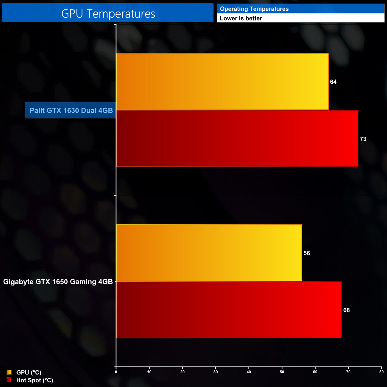 In terms of the thermals, the Palit Dual model is absolutely fine. The only comparison I have here is the Gigabyte 1650 Gaming OC, which is a much bigger card, but I’ve not been able to test any other 1630s. Still, the Dual hit 64c on the GPU and then 73c on the hotspot, so absolutely no complains from me.