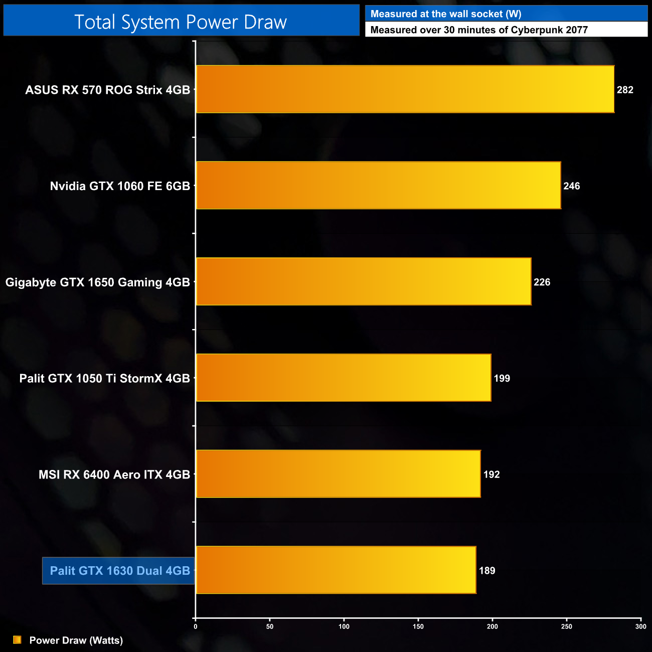 We measure system-wide power draw from the wall while running Cyberpunk 2077 for 30 minutes.