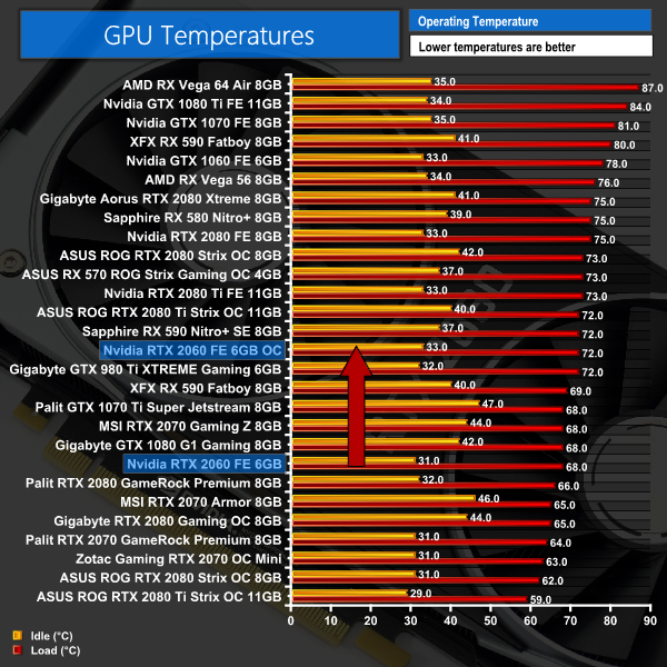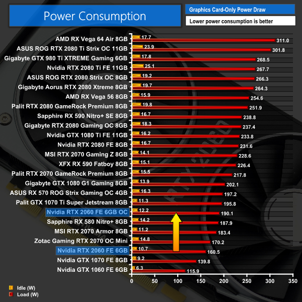 In terms of power, we saw the card draw almost 30W more, bringing the total power draw to 190.1W – so only marginally more than a reference clocked RTX 2070 card. The last metric to look at is average frequency, and here the card fell just short of the magic 2GHz figure, but an average clock speed of 1982MHz is still very impressive for a Founders card.