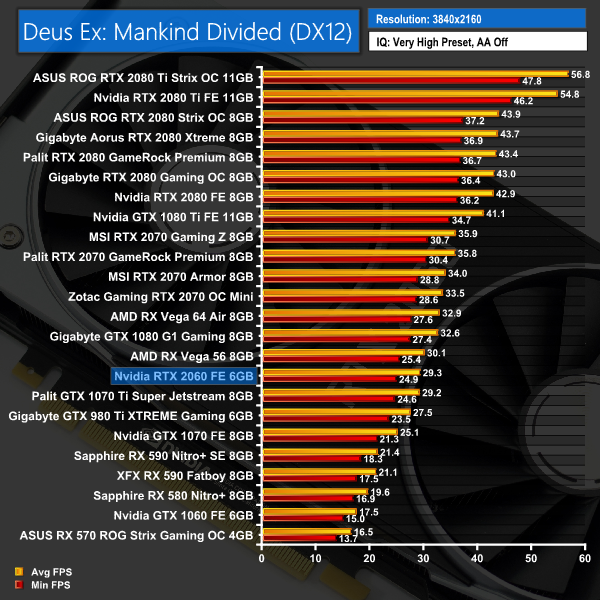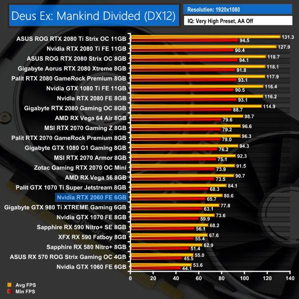 Our first game of the day, Deus Ex: Mankind Divided has the RTX 2060 behind the GTX 1070 Ti at both 1080p and 1440p, though it edges fractionally ahead – we are talking 0.1FPS – when the resolution is bumped up to 4K.