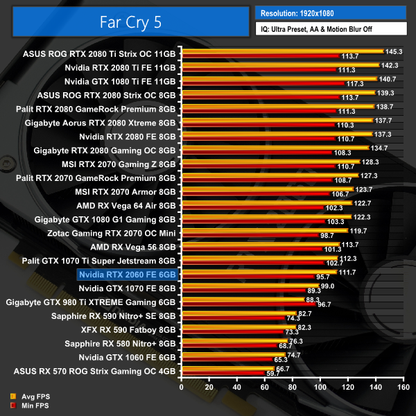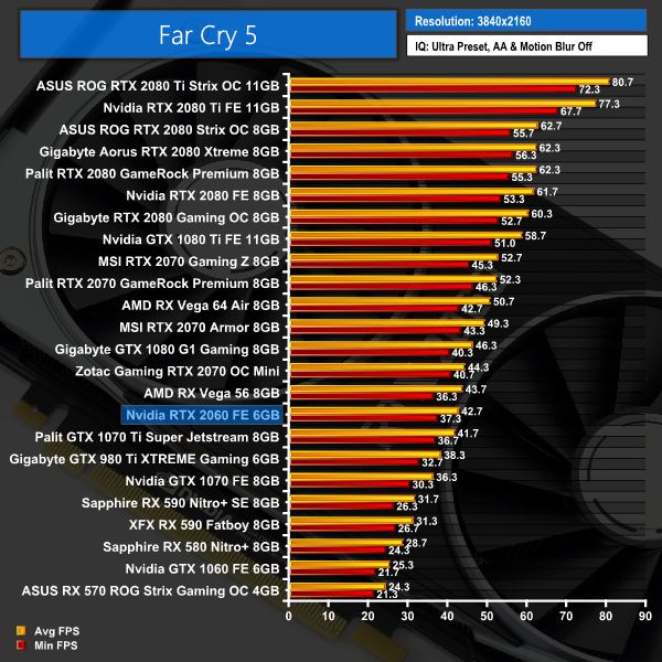 Far Cry 5 again has the 2060 positioned very closely to the 1070 Ti. This time, the 2060 is just 0.6FPS slower at 1080p, but it edges ahead at 1440p and 4K resolutions.