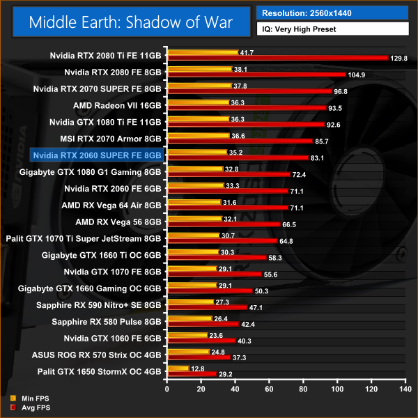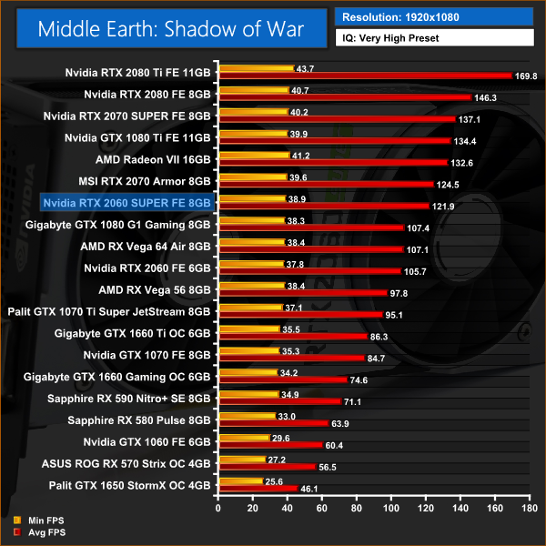 Middle Earth: Shadow of War shows a difference of 3.6FPS between RTX 2060 SUPER and RTX 2070 when gaming at 1080p – which works out to be one of the biggest gaps between the two cards across all of our games. That just shows you how close the two cards actually are.