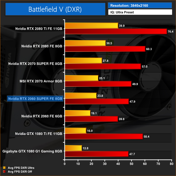 We test using the Ultra preset with the DX12 API. Battlefield V was the first game released with Nvidia RTX ray tracing features (called DXR in game) and we present average frame rates for the game with DXR Off, and then again with DXR set to Ultra.