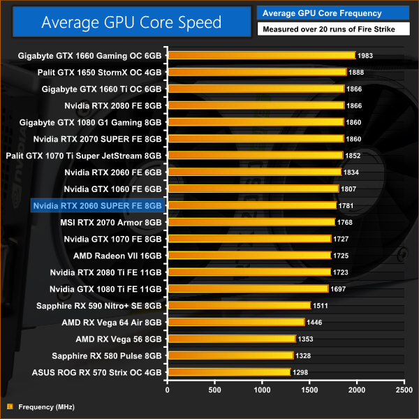 As a reference card, with a rated boost clock of 1650MHz, we don't see spectacularly high frequencies from the 2060 SUPER. It does exceed its rated boost clock by 131MHz, but I would expected aftermarket cards to be running up to 200MHz faster out of the box.
