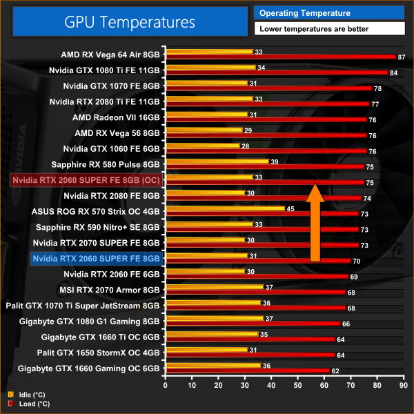 The card did show the effects of this overclock, but nothing terrible. Temperatures increased by 5C, up to 75C, and noise levels also rose by 4dB. The latter was noticeable, but still not painfully annoying.