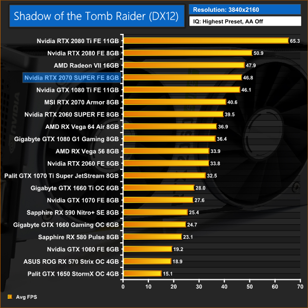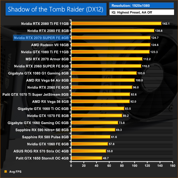 Shadow of the Tomb Raider picks up where Shadow of War left off, as the 2070 SUPER is again faster than a 1080 Ti across all three resolutions tested. It is also faster than Radeon VII at 1080p and 1440p, but the AMD card comes back at 4K to regain the lead.
