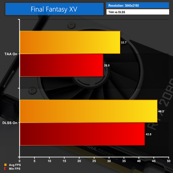 Nvidia supplied another demo for the purposes of this review – this time from Final Fantasy XV. We were able to run the demo at 4K with both TAA and DLSS anti aliasing solutions. We used FRAPS to extract minimum and average FPS figures, after a 1-minute run.