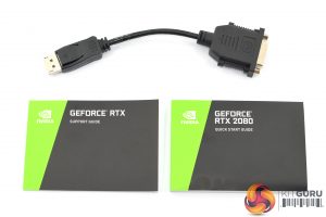 Inside, the included accessories consist of: 1x support guide, 1x quick start guide, and 1x DisplayPort to DVI adapter. The display adapter is something we first saw included with the GTX 1080 Ti as Nvidia removed the DVI connector from that card.