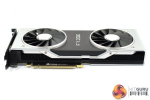 Most obviously, it has ditched the single radial fan (blower-style fan) in favour of dual axial 13-blade fans. These measure 90mm and sit either side of a black aluminium section that is home to the RTX branding. The silver sections are also made of aluminium, and the card definitely feels very premium in the hand – it weighs in at just under 1.3KG.