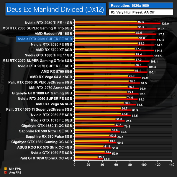 In Deus Ex: Mankind Divided we see an average performance increase of 4% for the 2080 SUPER over the 2080. It's enough to take it past the Radeon VII at 4K.