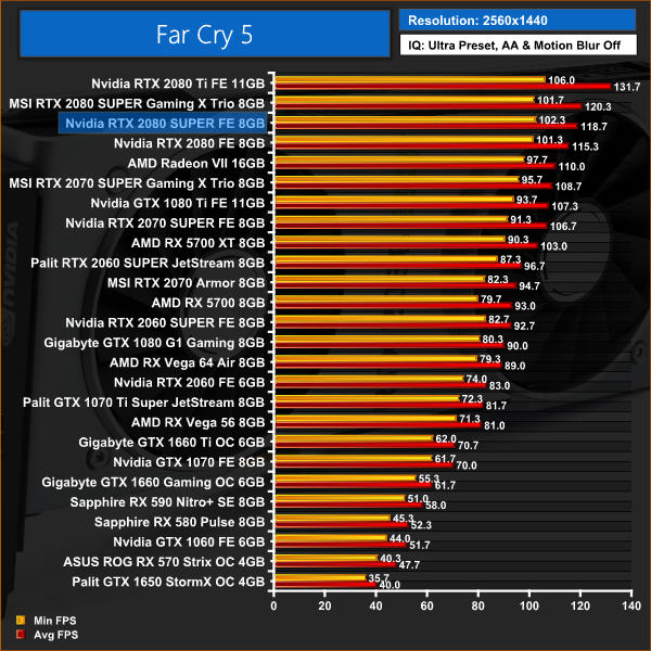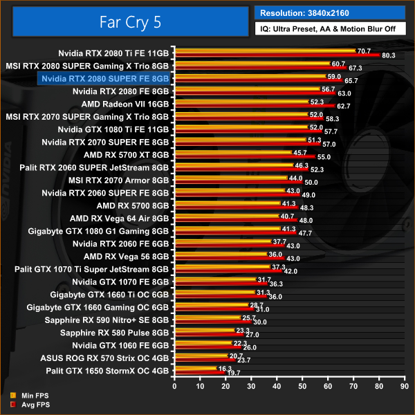 Things are more congested when playing Far Cry 5 at 1080p, with a pretty obvious CPU bottleneck affecting the results. Again at 4K, however, we see the 2080 SUPER outperforming the 2080 by around 4%.