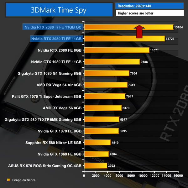 This overclock had a big effect on the performance of the RTX 2080 Ti – the Fire Strike score jumped over 2000 points (+6.4%) while we also gained an extra 7.3FPS on average when playing Far Cry 5 at 4K.
